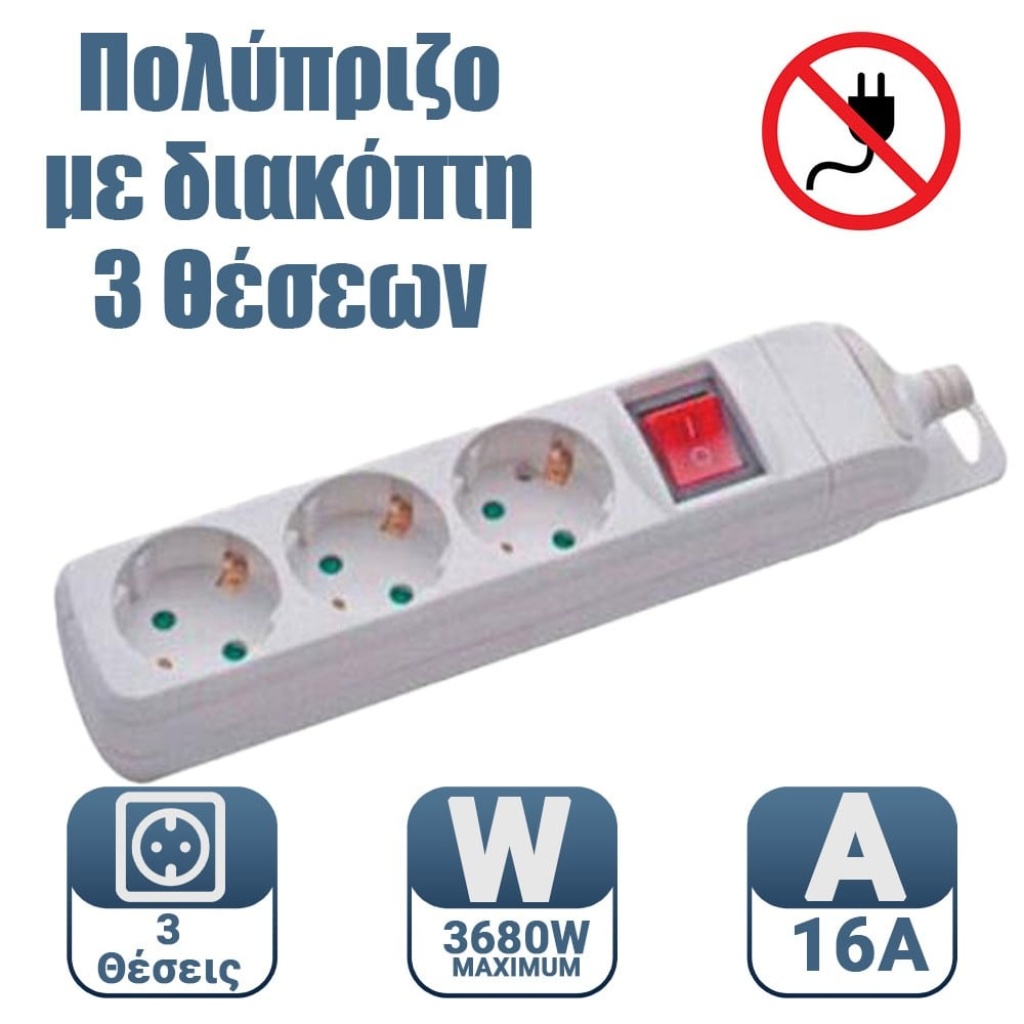 Πολύπριζο 3 Θέσεων με Διακόπτη Χωρίς Καλώδιο