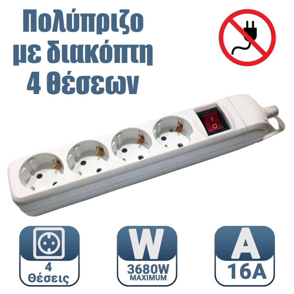 Πολύπριζο 4 Θέσεων με Καλώδιο 1.5m και Προστασία Επαφών