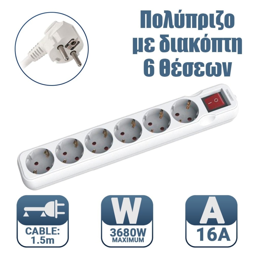 Πολύπριζο 6 Θέσεων με Καλώδιο 3X1,5mm 1,5m και Προστασία Επαφών