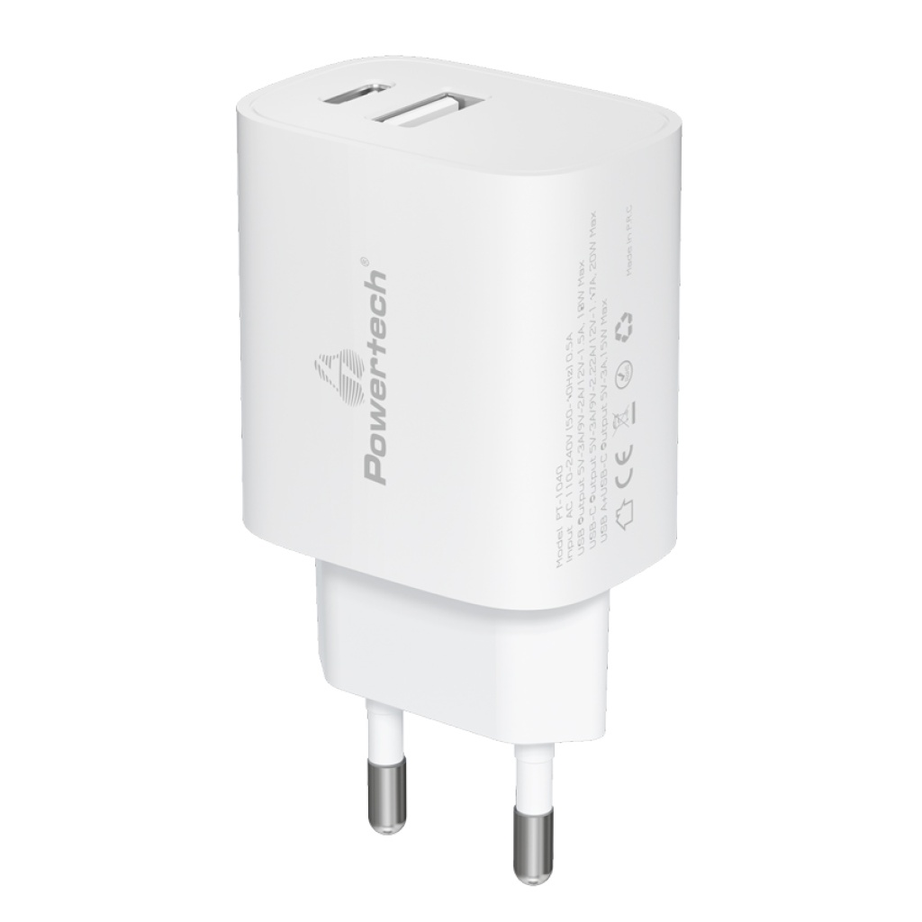 POWERTECH φορτιστής τοίχου PT-1040, USB & USB-C, PD QC3.0, 20W, λευκός