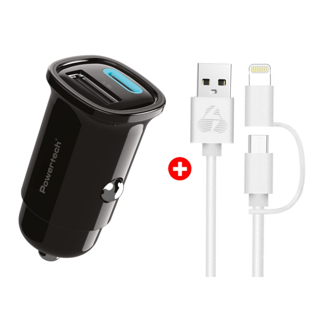 POWERTECH φορτιστής αυτοκινήτου με καλώδιο MFi USB σε micro USB/Lightning BNDL-0206, USB & USB-C, 30W, μαύρο/λευκό