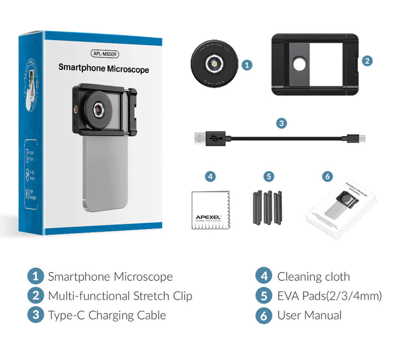 Ο φακός μικροσκόπιο APL-MS009 της Apexel αποτελεί το τέλειο αξεσουάρ για το smartphone σας! Τοποθετείται εύκολα μπροστά από την κάμερα του smartphone, επιτρέποντας σας να τραβήξετε φωτογραφίες και βίντεο, ή να παρακολουθήσετε αντικείμενα, με 100x zoom. Επιπλέον, ενσωματώνει LED φωτισμό, ο οποίος διευκολύνει την χρήση του σε πιο σκοτεινά περιβάλλοντα. Ο φωτισμός είναι επαναφορτιζόμενος και φορτίζει μέσω θύρας USB-C (συμπεριλαμβάνεται καλώδιο φόρτισης).