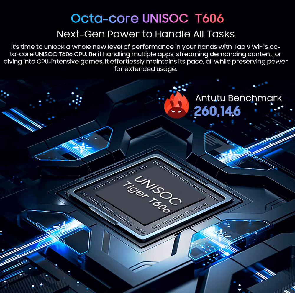 Εξοπλισμένο με επεξεργαστή 8 πυρήνων και λειτουργικό Android 14, το Tab 9 WiFi προσφέρει υψηλή απόδοση για απρόσκοπτη περιήγηση στο διαδίκτυο, παιχνίδια, πολυμέσα και πολλά άλλα.