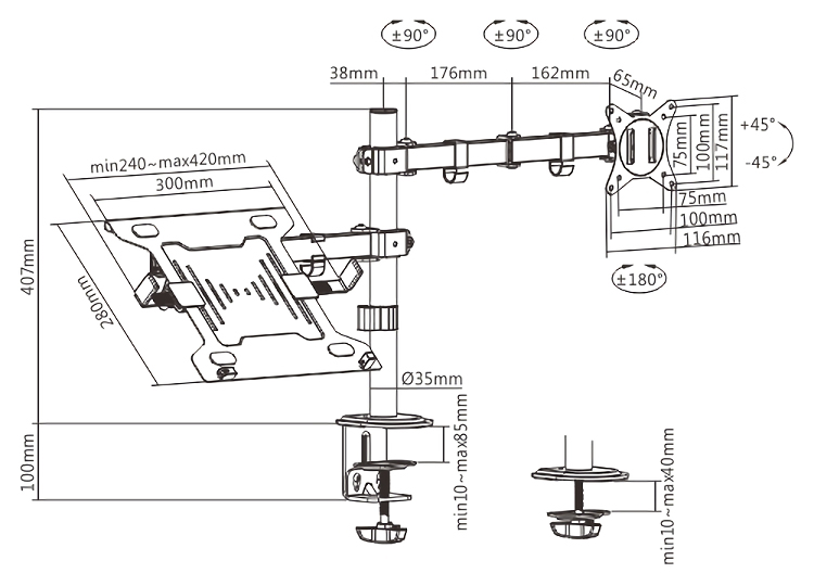 Πάχος επιφάνειας εργασίας: Clamp: 10~85mm, Grommet: 10~40mm