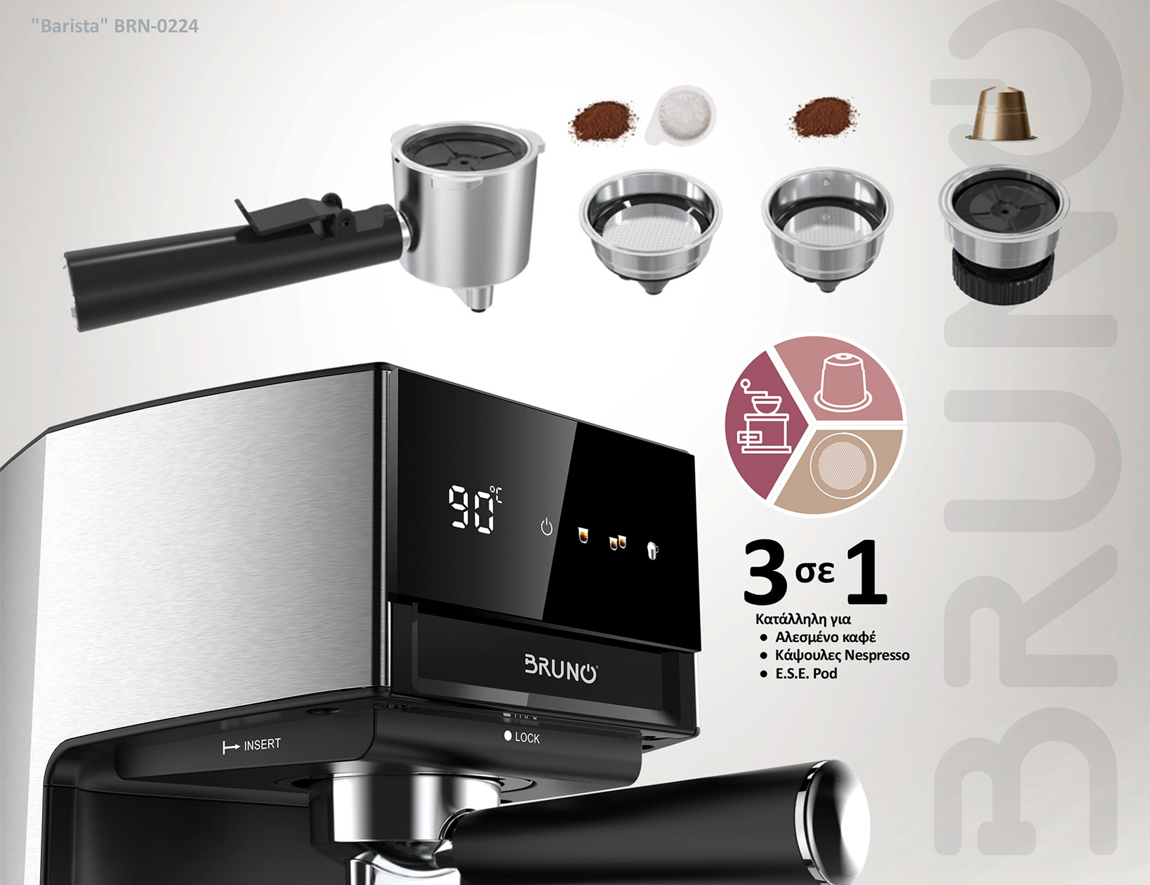 Η Μηχανή Espresso & Cappuccino, 3 σε 1, Hot & Cold, BRUNO “Barista” BRN-0224 συνδυάζει την απόλυτη ευελιξία στην ετοιμασία του αγαπημένους σας ροφήματος, το άψογο αποτέλεσμα στην γεύση του καφέ και την ευκολία στην χρήση!