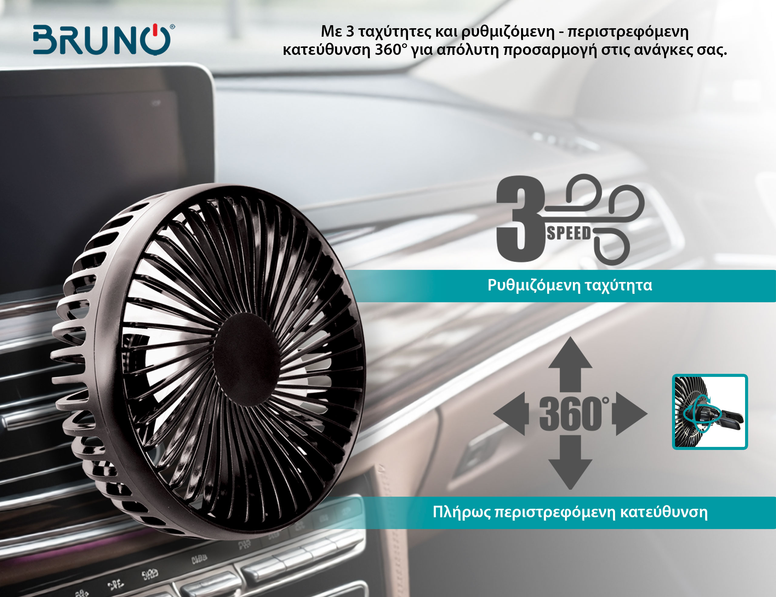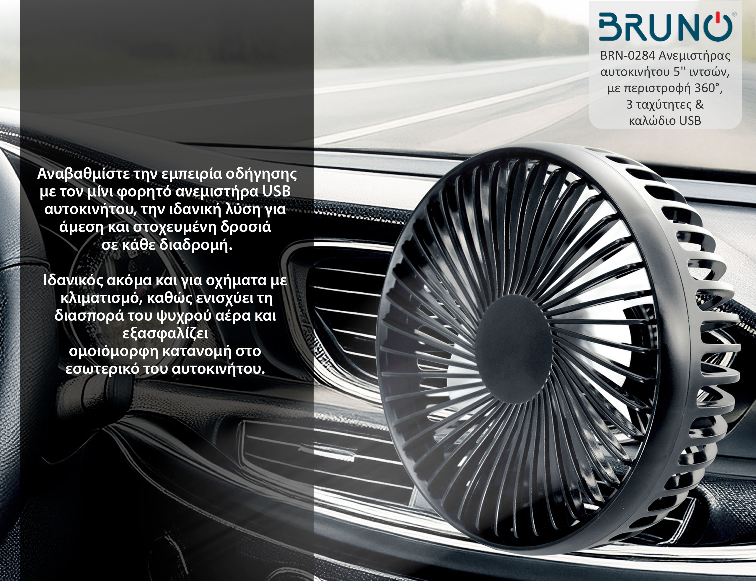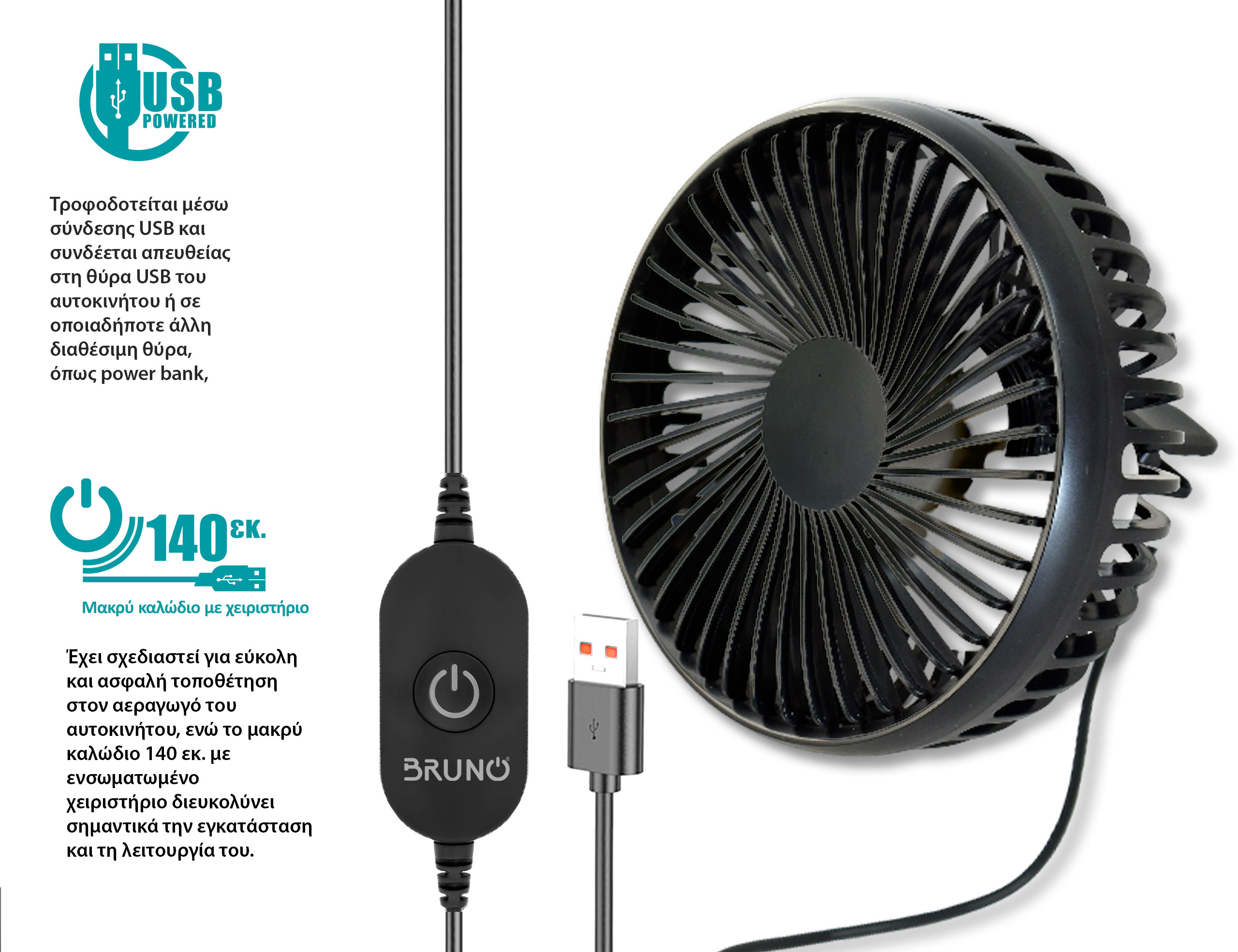 BRUNO ανεμιστήρας αυτοκινήτου BRN-0284, 5″ ιντσών, με περιστροφή 360°, 2 ταχύτητες και καλώδιο USB