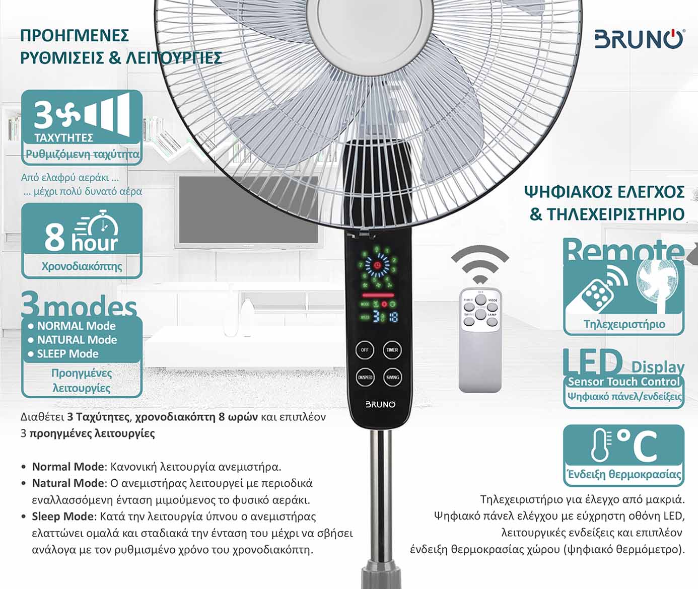 Διαθέτει επίσης 3 MODE λειτουργίας, (Normal / Natural / Sleep) και 3 ταχύτητες ανεμιστήρα.