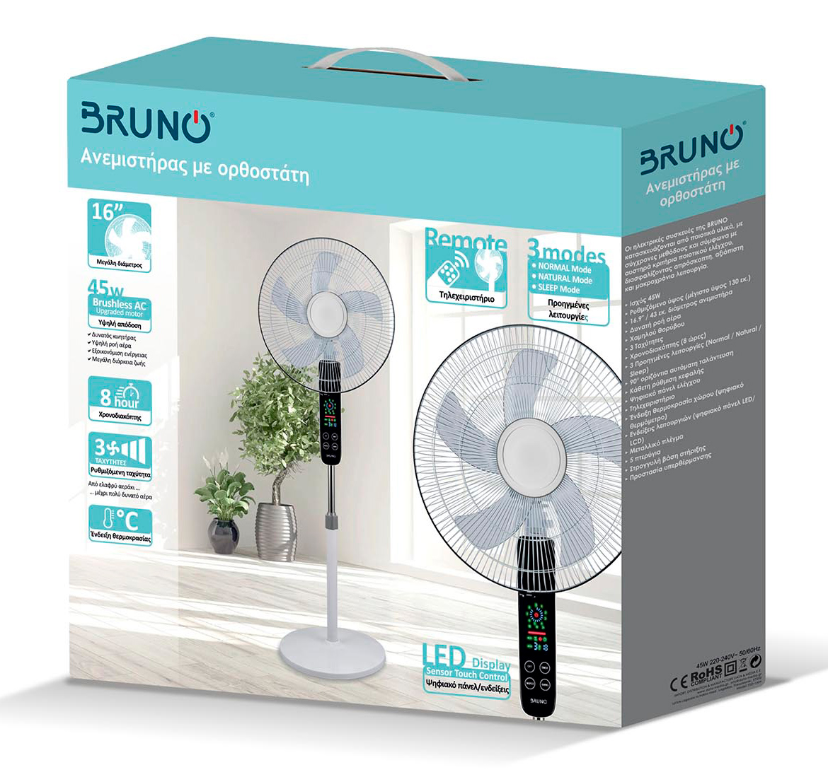 BRUNO ανεμιστήρας προηγμένων λειτουργιών BRN-0189 με τηλεχειριστήριο, 45W, Φ43εκ x 130εκ, λευκός
