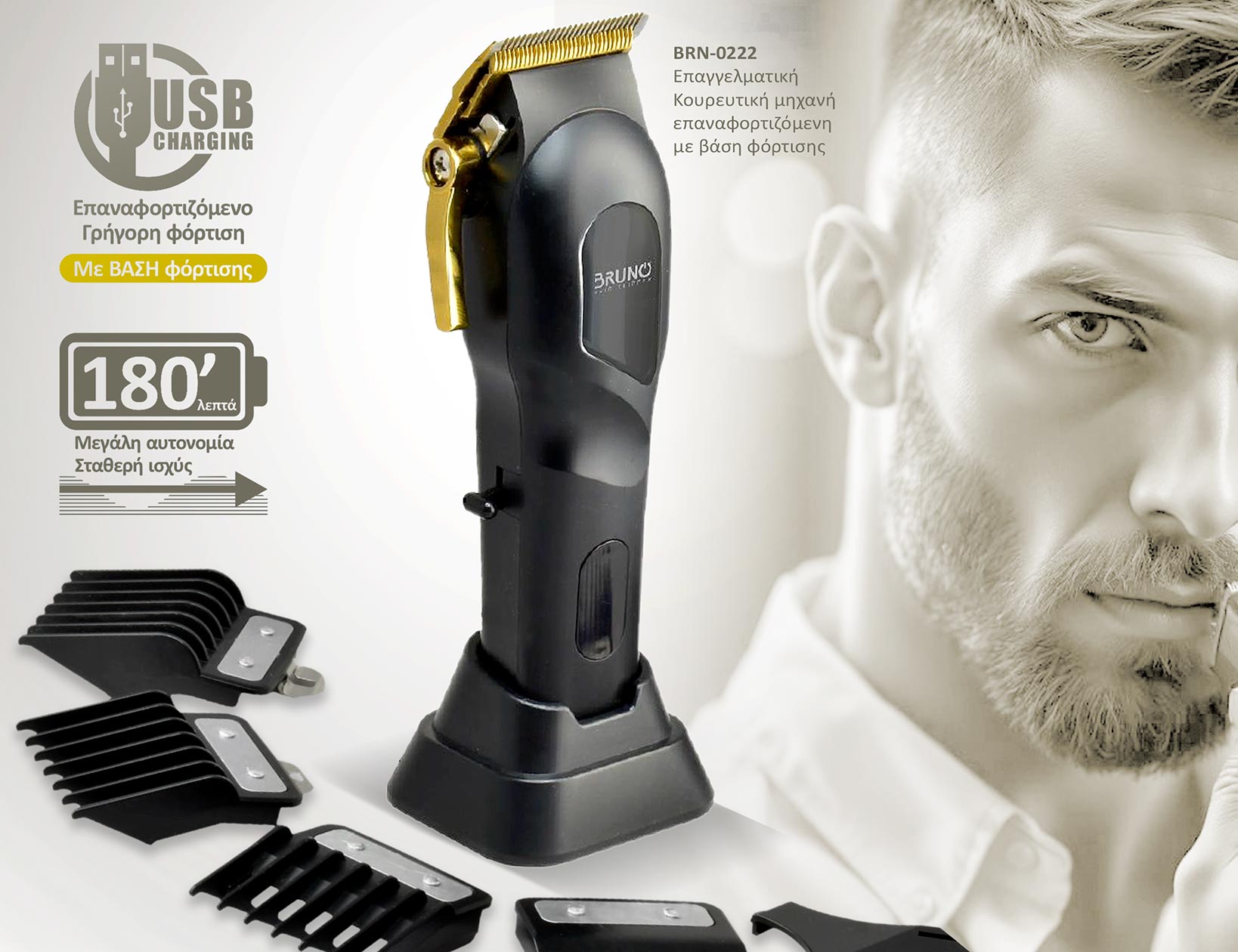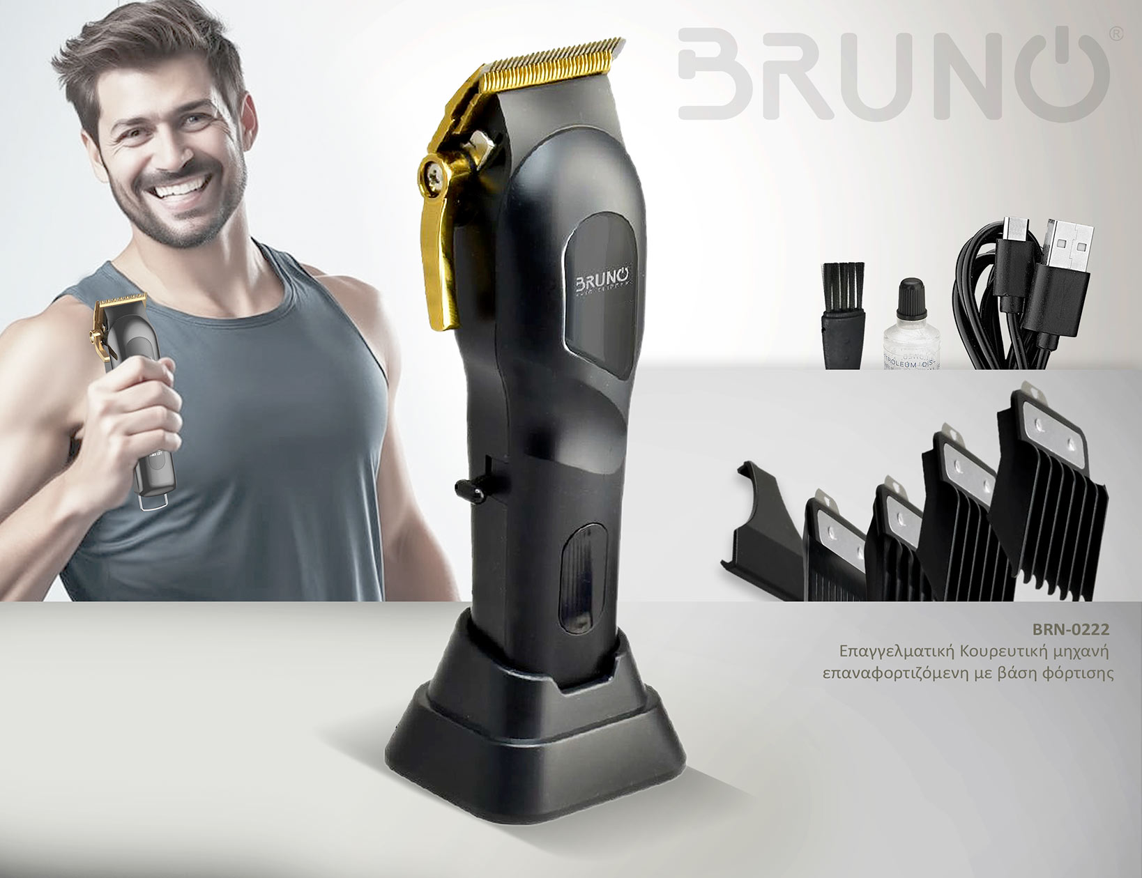 BRUNO επαγγελματική κουρευτική μηχανή BRN-0222 με βάση, επαναφορτιζόμενη, μαύρη