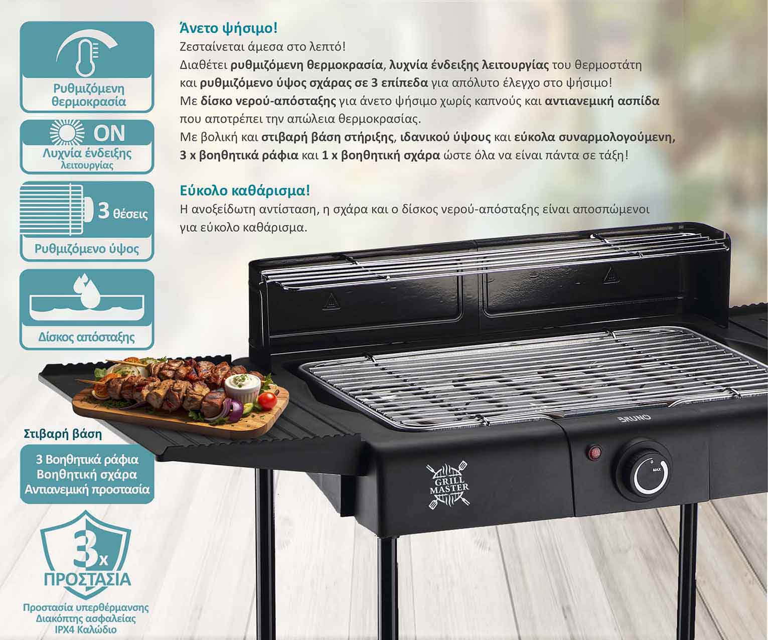 BRUNO επιδαπέδια ηλεκτρική ψησταριά BRN-0190, 2400W, με βάση & ρυθμιζόμενο θερμοστάτη, μαύρη