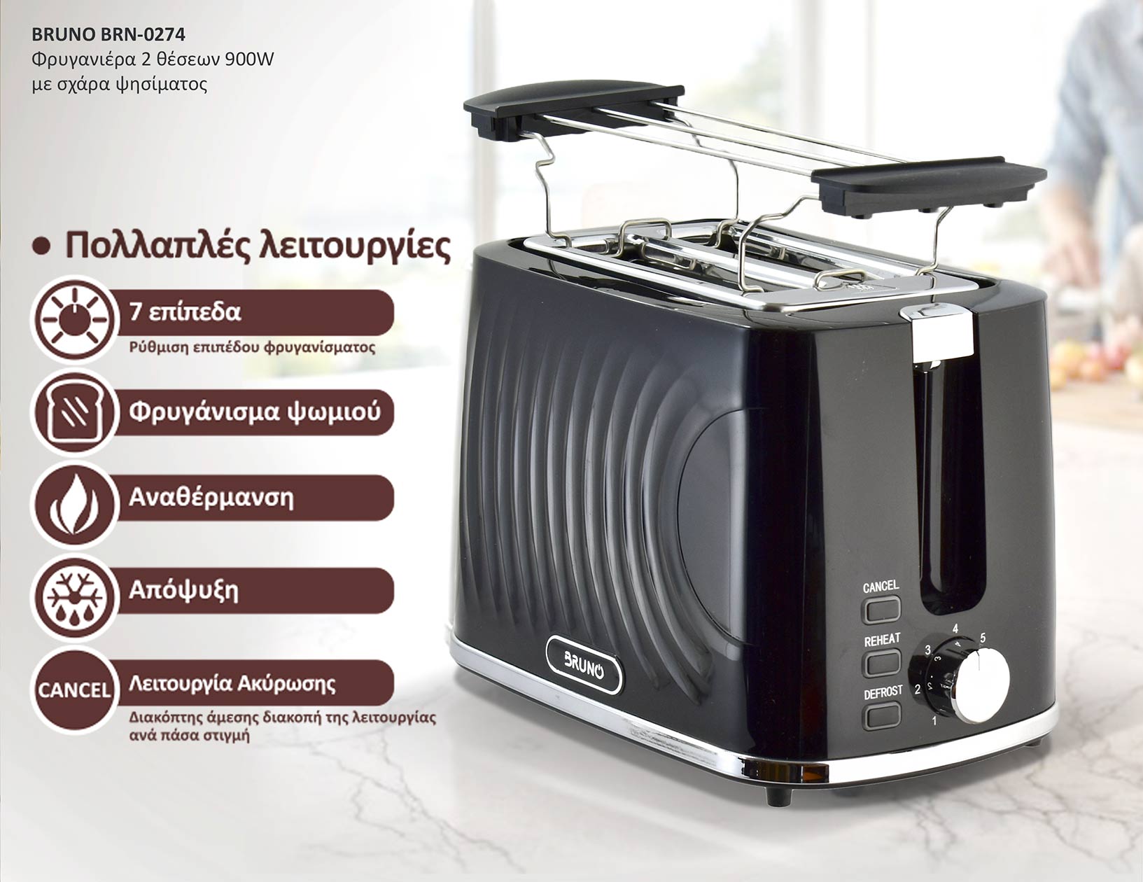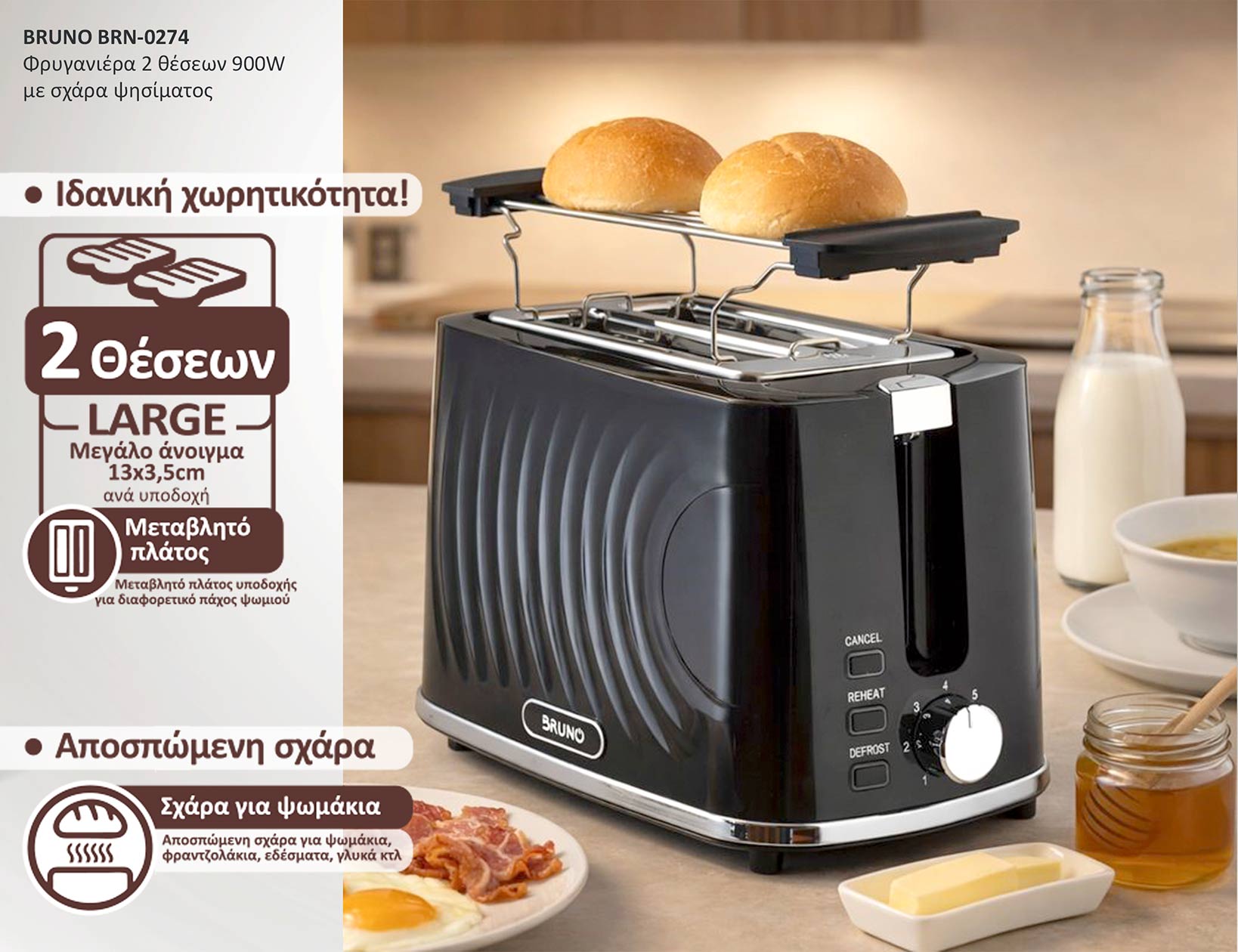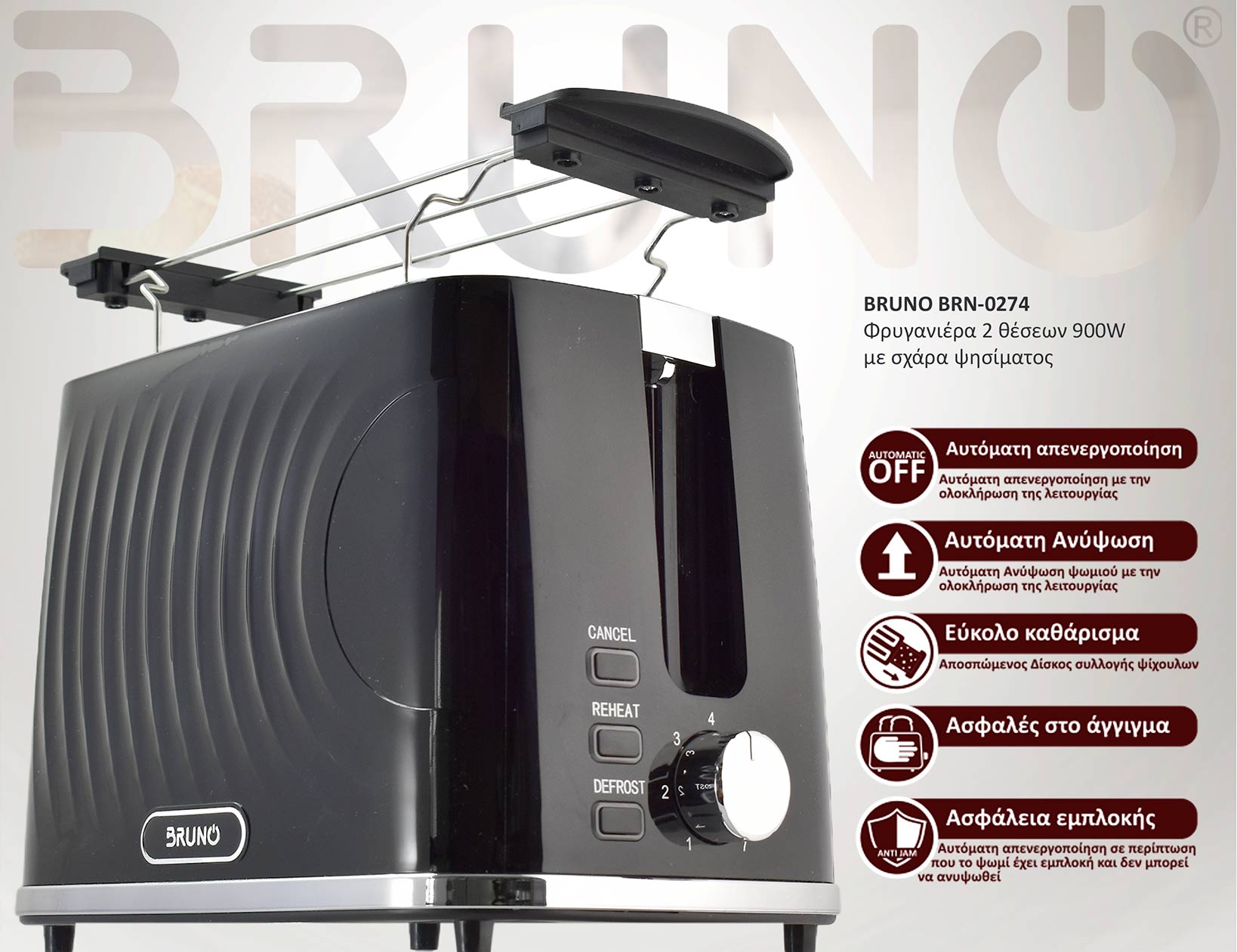 BRUNO φρυγανιέρα BRN-0274, 2 θέσεων, 900W, με σχάρα ψησίματος, μαύρη