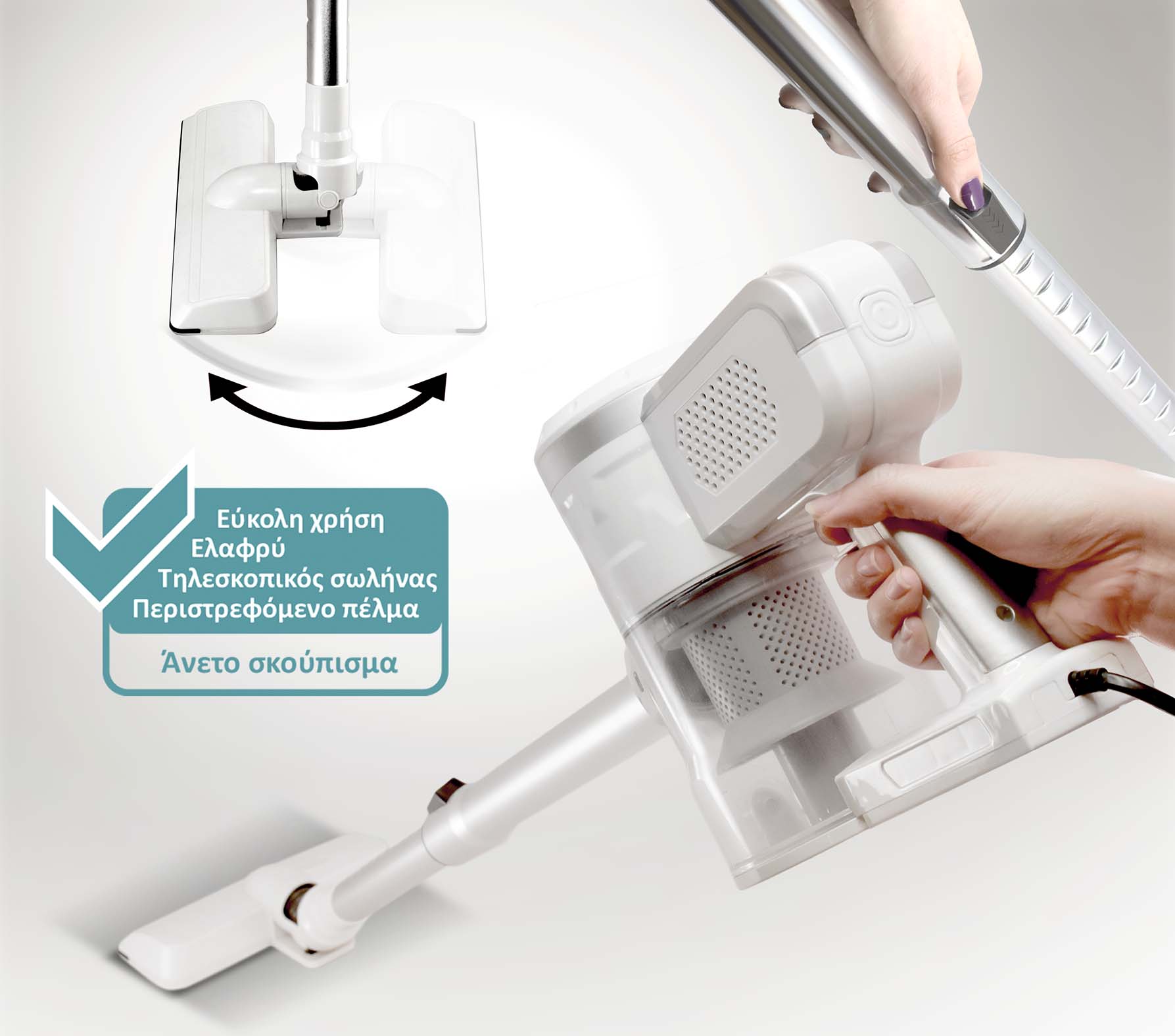 Πέλμα: υψηλής απόδοσης πλαστικό πέλμα (περιστρεφόμενο αριστερά-δεξιά για άνετο σκούπισμα)