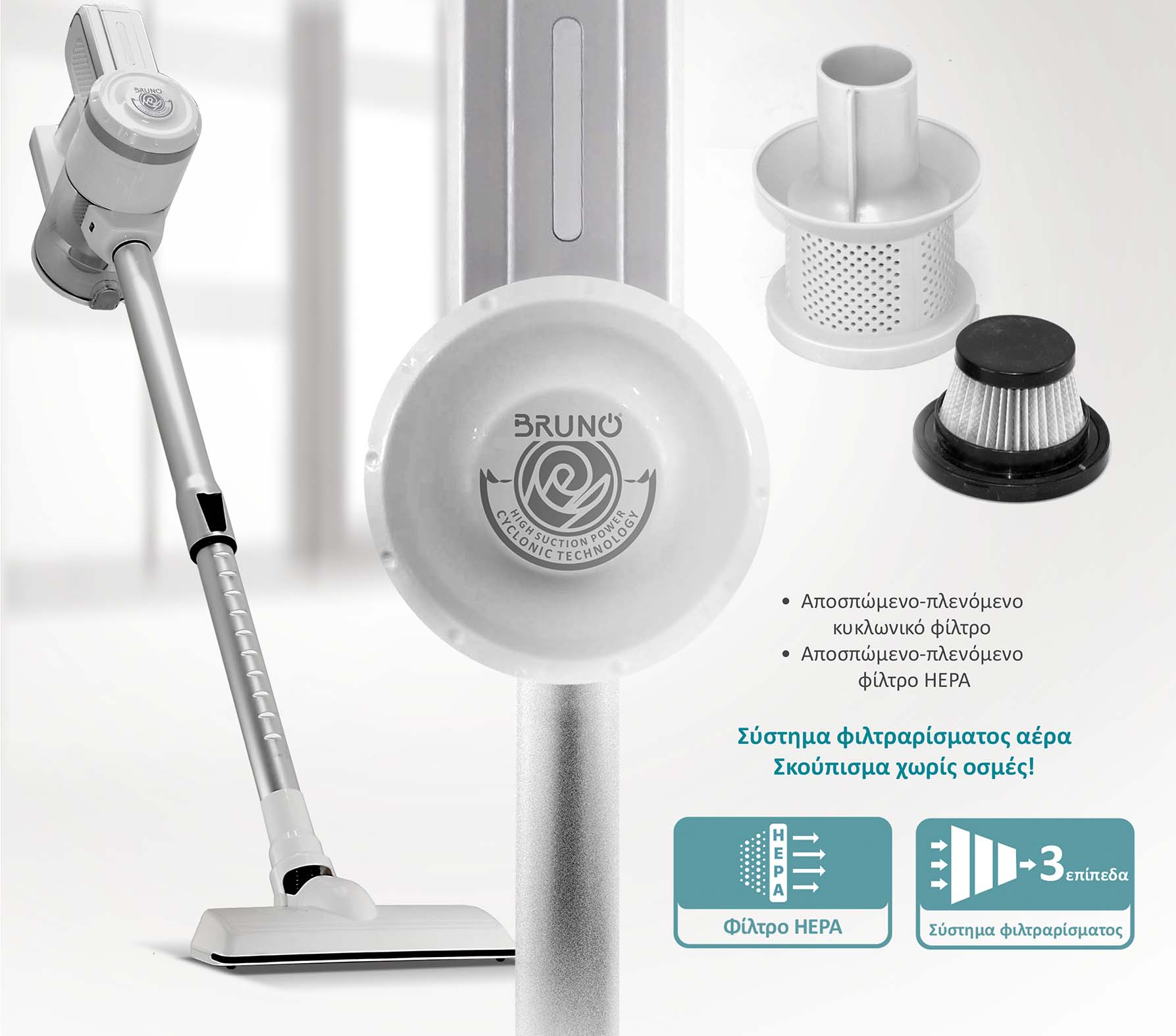 Φίλτρο εισαγωγής αέρα: ναι (Κυκλωνικό φίλτρο κάδου και αποσπώμενο-πλενόμενο φίλτρο HEPA)