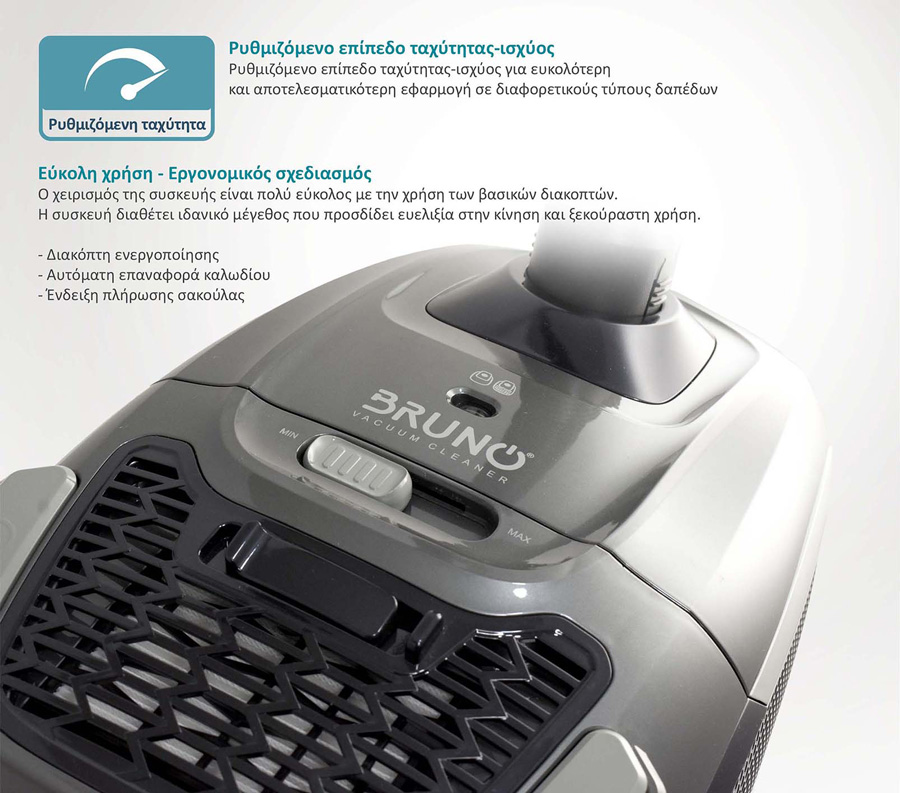Συναρμολογείται γρήγορα. Ενεργοποιείτε, απενεργοποιείτε και ρυθμίζετε εύκολα την ισχύ-ταχύτητα στο επίπεδο που επιθυμείτε ανάλογα με την επιφάνεια που καθαρίζετε. Με την ένδειξη πλήρωσης σακούλας γνωρίζετε άμεσα πότε πρέπει να αδειάσετε την σακούλα. Αδειάζετε ή αντικαθιστάτε την σακούλα πολύ εύκολα όποτε χρειαστεί. Με το ελαφρύ βάρος, τον εργονομικό σχεδιασμό στους τροχούς και το λειτουργικό πέλμα, σκουπίζετε και μεταφέρεστε στον χώρο άνετα χωρίς κούραση. Διαθέτει αυτόματη επαναφορά καλωδίου.