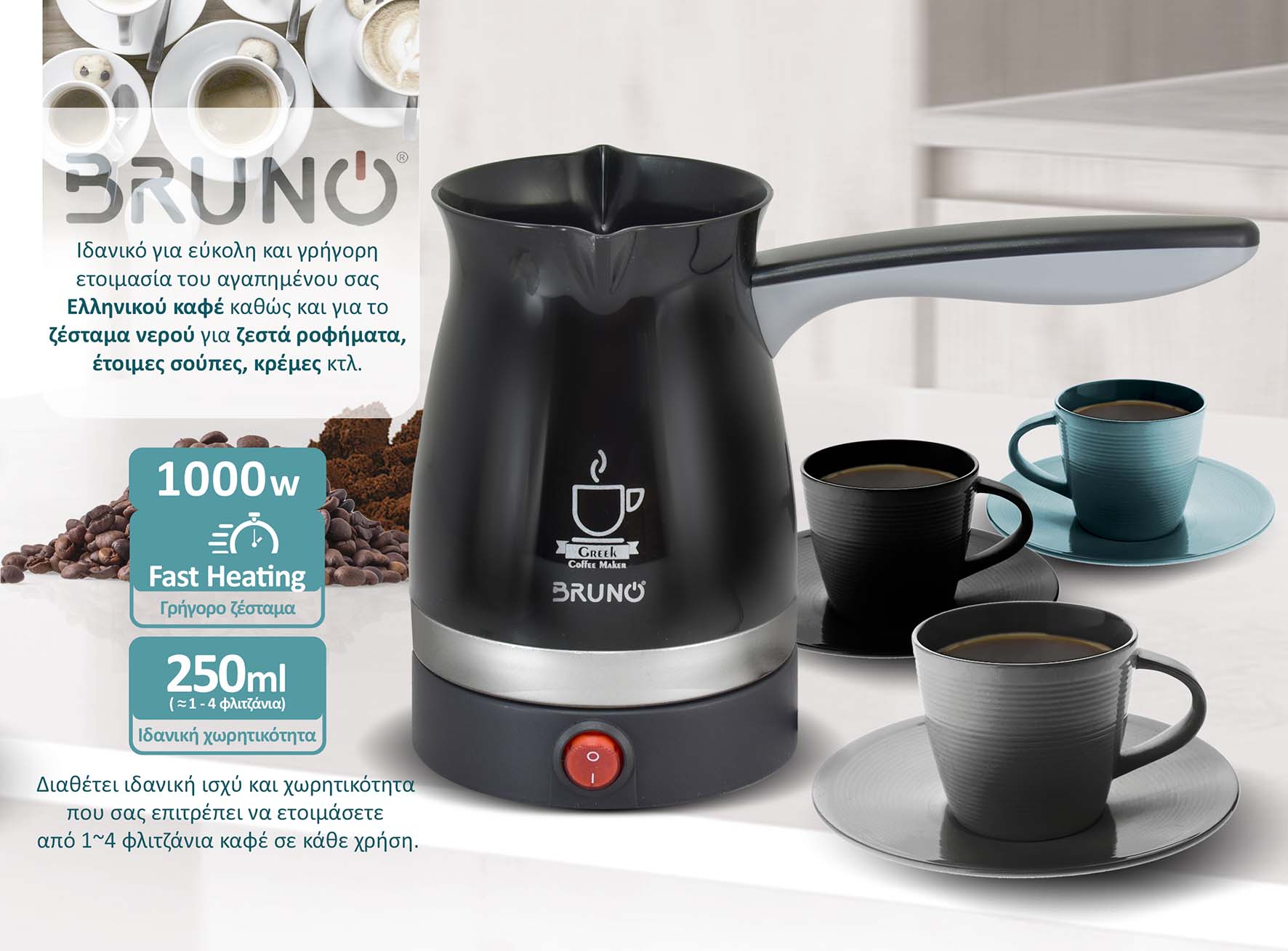 -Βασικές Λειτουργίες: Παρασκευή Ελληνικού καφέ, βράσιμο-ζέσταμα νερού