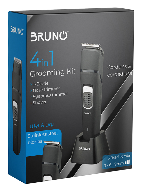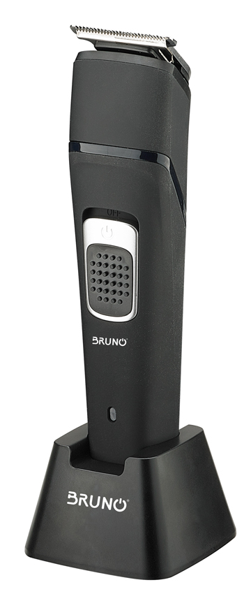 Κουρευτική μηχανή Bruno, με 6 εξαρτήματα για ξύρισμα, κούρεμα και περιποίηση. Εξοπλίζεται με ανθεκτικές λεπίδες από ανοξείδωτο ατσάλι και λειτουργεί με μπαταρία ή καλώδιο ρεύματος. Μπορεί να χρησιμοποιηθεί είτε σε υγρές είτε σε στεγνό τρίχωμα. Η ενσωματωμένη μπαταρία προσφέρει στη μηχανή αυτονομία έως 90 λεπτά.