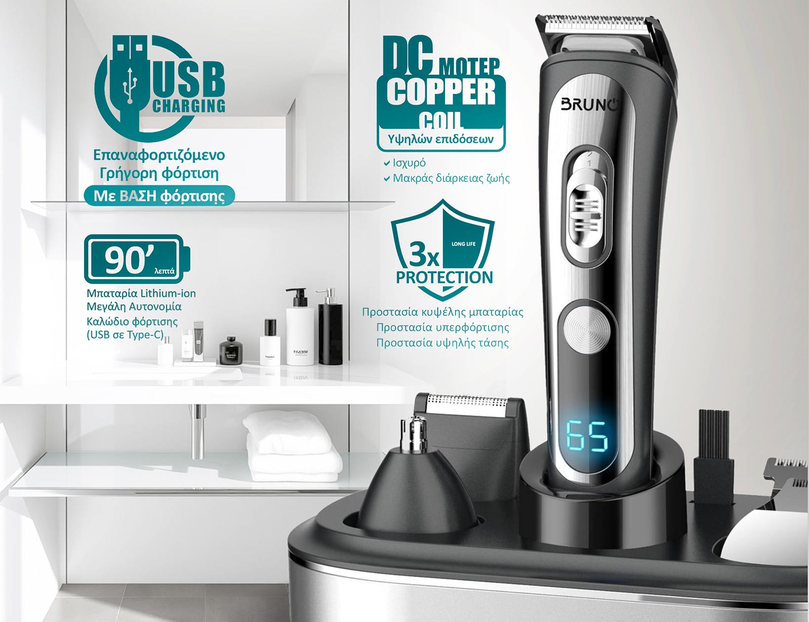 Το σετ επαναφορτιζόμενης κουρευτική/ξυριστικής μηχανής BRUNO BRN-0221, είναι ιδανικό για την καθημερινή ανδρική περιποίηση.