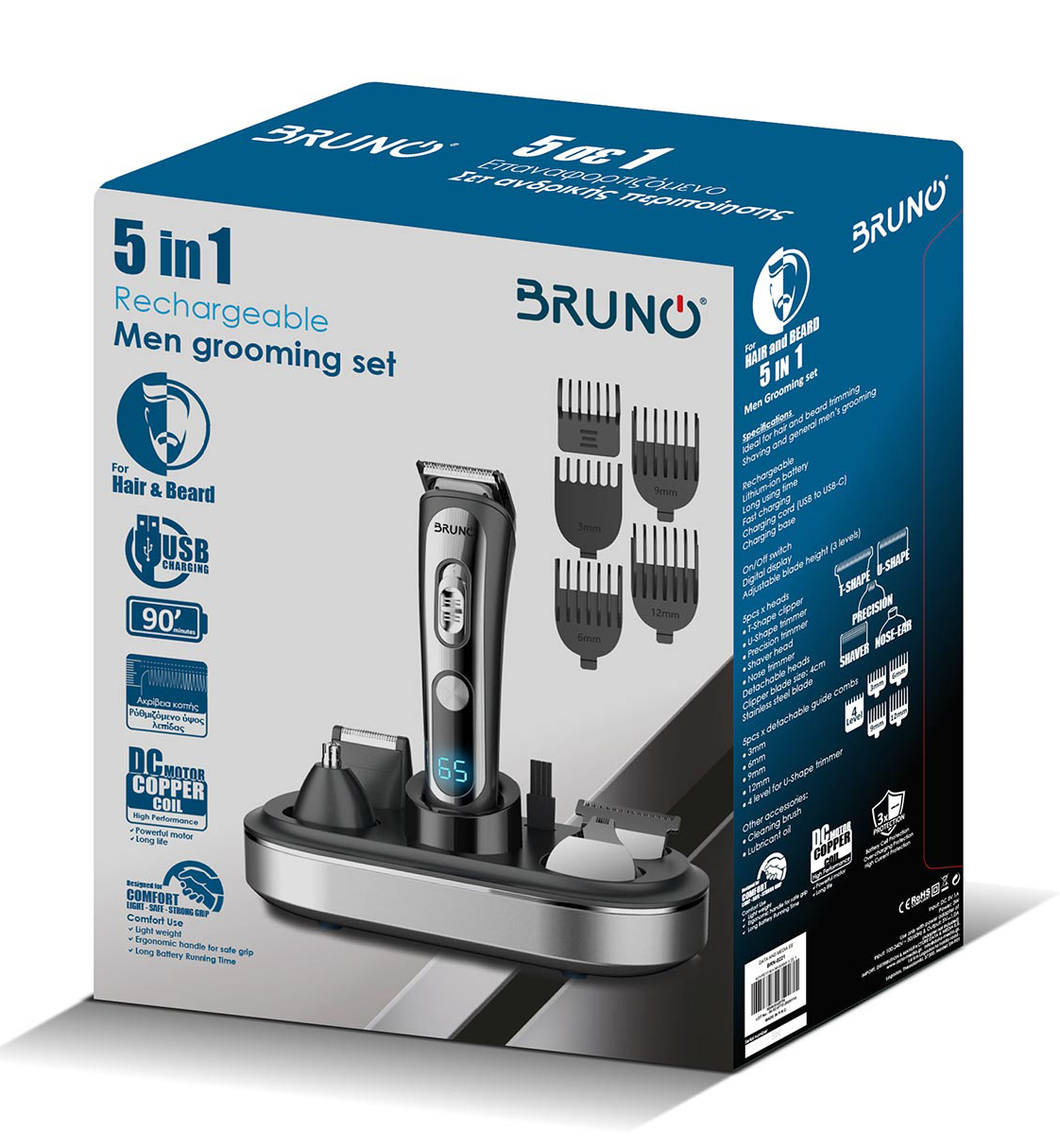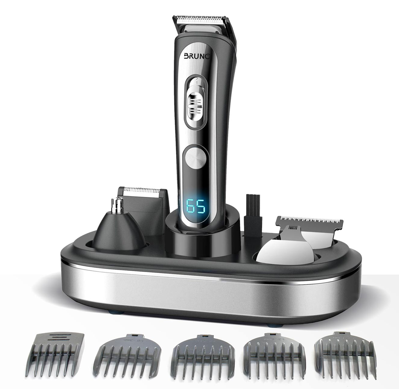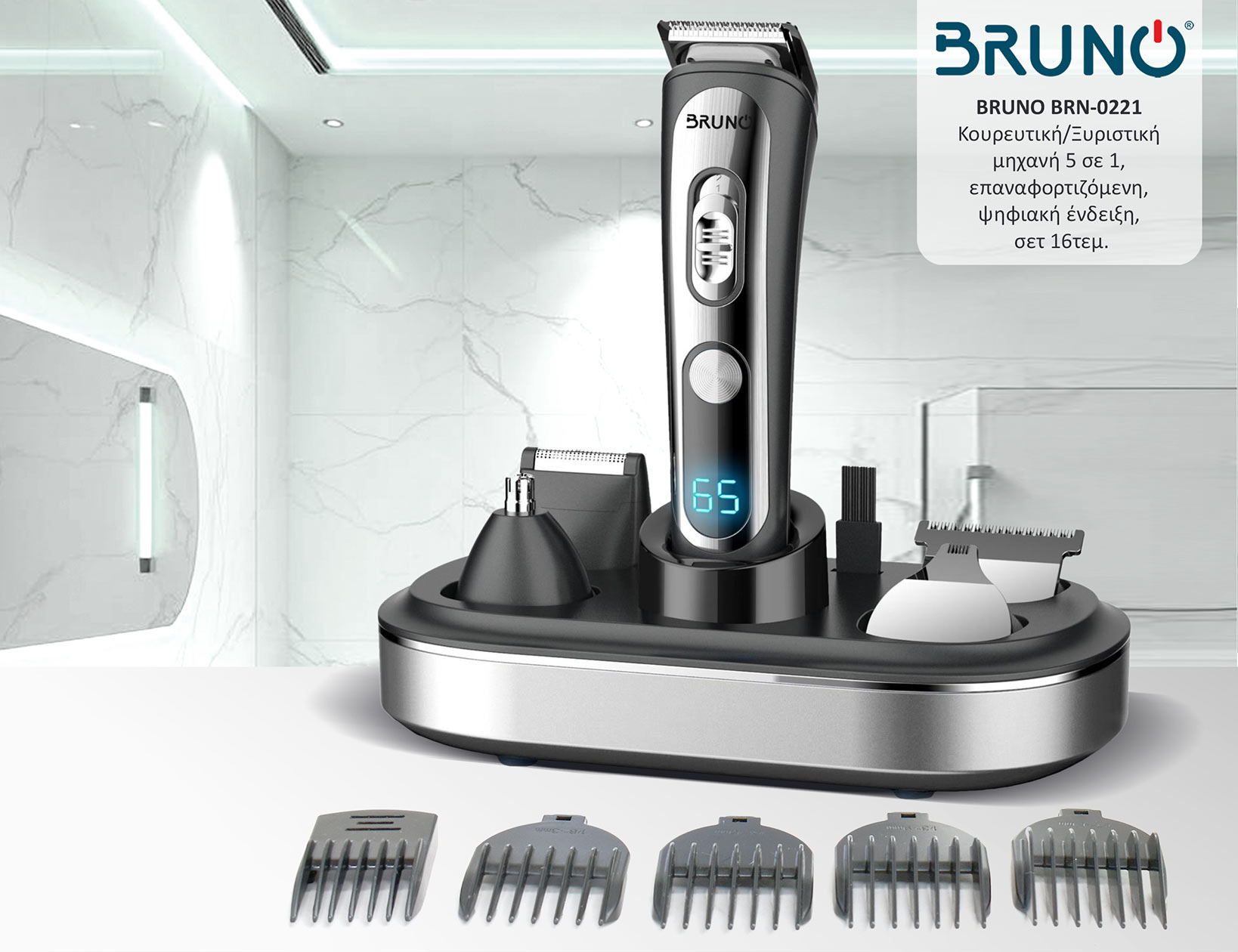 BRUNO κουρευτική/ξυριστική μηχανή 5 σε 1 BRN-0221, επαναφορτιζόμενη, ψηφιακή ένδειξη, black-inox, σετ 16τμχ