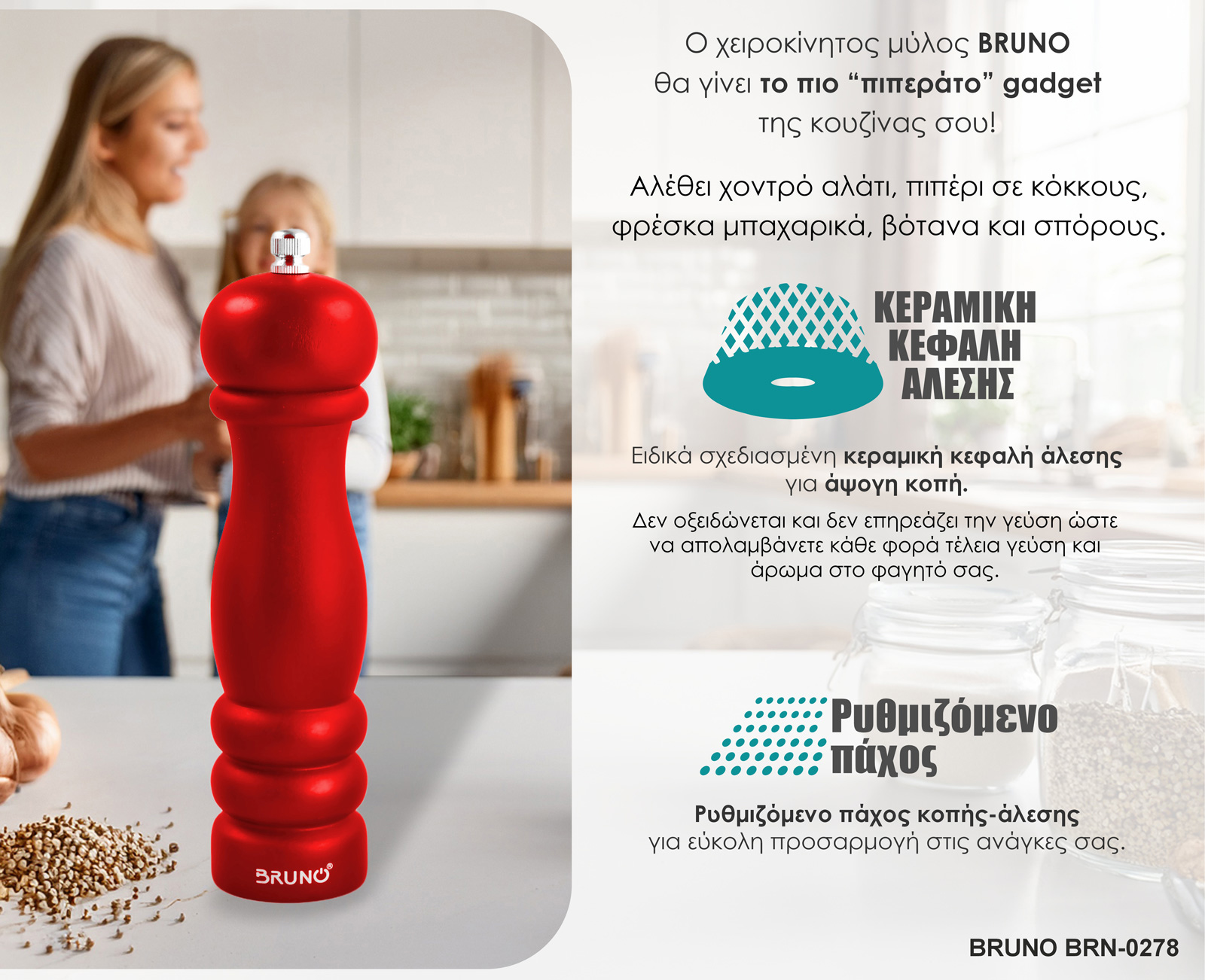 BRUNO μύλος αλατιού-πιπεριού BRN-0278 με κεραμική κεφαλή, κόκκινος