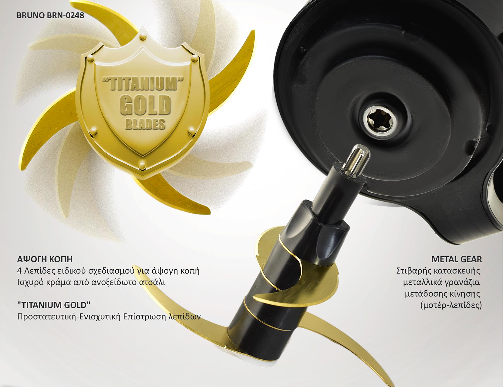 Χαρακτηριστικά του η άψογη κοπή και η γρήγορη-άνετη χρήση, χάρις στις 4 μεγάλες λεπίδες ειδικού σχεδιασμού “TITANIUM GOLD”, στο πανίσχυρο τύπο μοτέρ 500W καθώς και την στιβαρή κατασκευή μηχανικών τμημάτων με μεταλλικά γρανάζια μετάδοσης κίνησης.