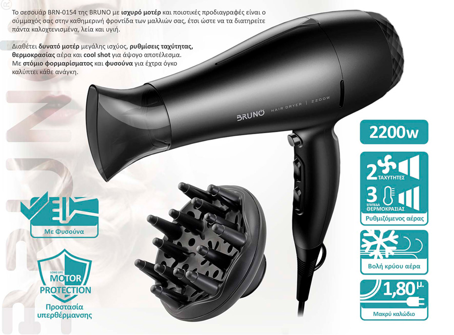 BRUNO σεσουάρ μαλλιών BRN-0154, 2200W, με φυσούνα, μαύρο