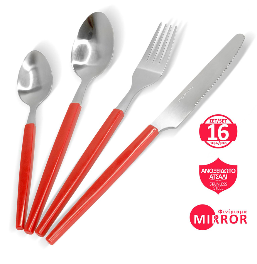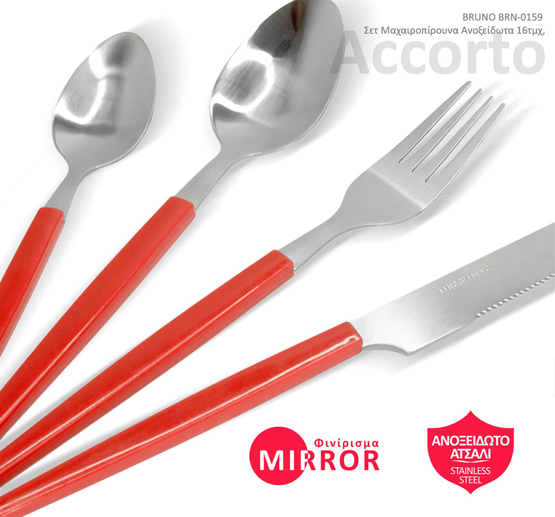 Σετ μαχαιροπίρουνα 16 τεμαχίων Accorto από την BRUNO, με πλαστική λαβή, κατασκευασμένα από ανοξείδωτο ατσάλι σε μοντέρνο σχέδιο και φινίρισμα “καθρέφτη”.