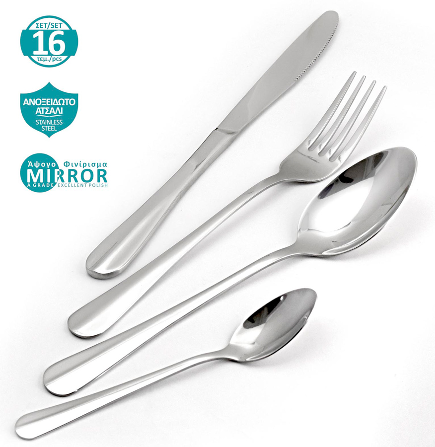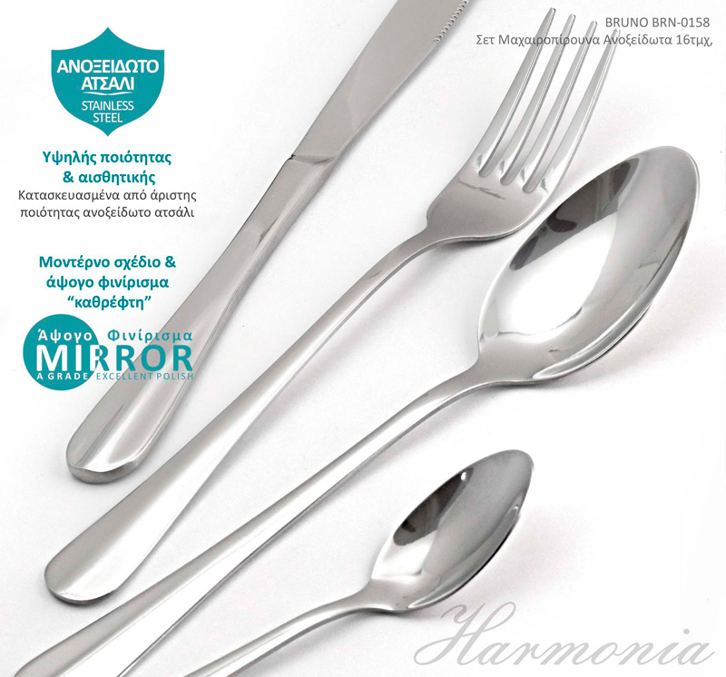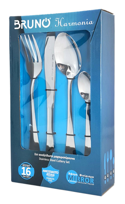 Σετ μαχαιροπίρουνα 16 τεμαχίων Harmonia από την Bruno, υψηλής ποιότητας και αισθητικής, κατασκευασμένα από άριστης ποιότητας ανοξείδωτο ατσάλι σε μοντέρνο σχέδιο και άψογο φινίρισμα “καθρέφτη”.