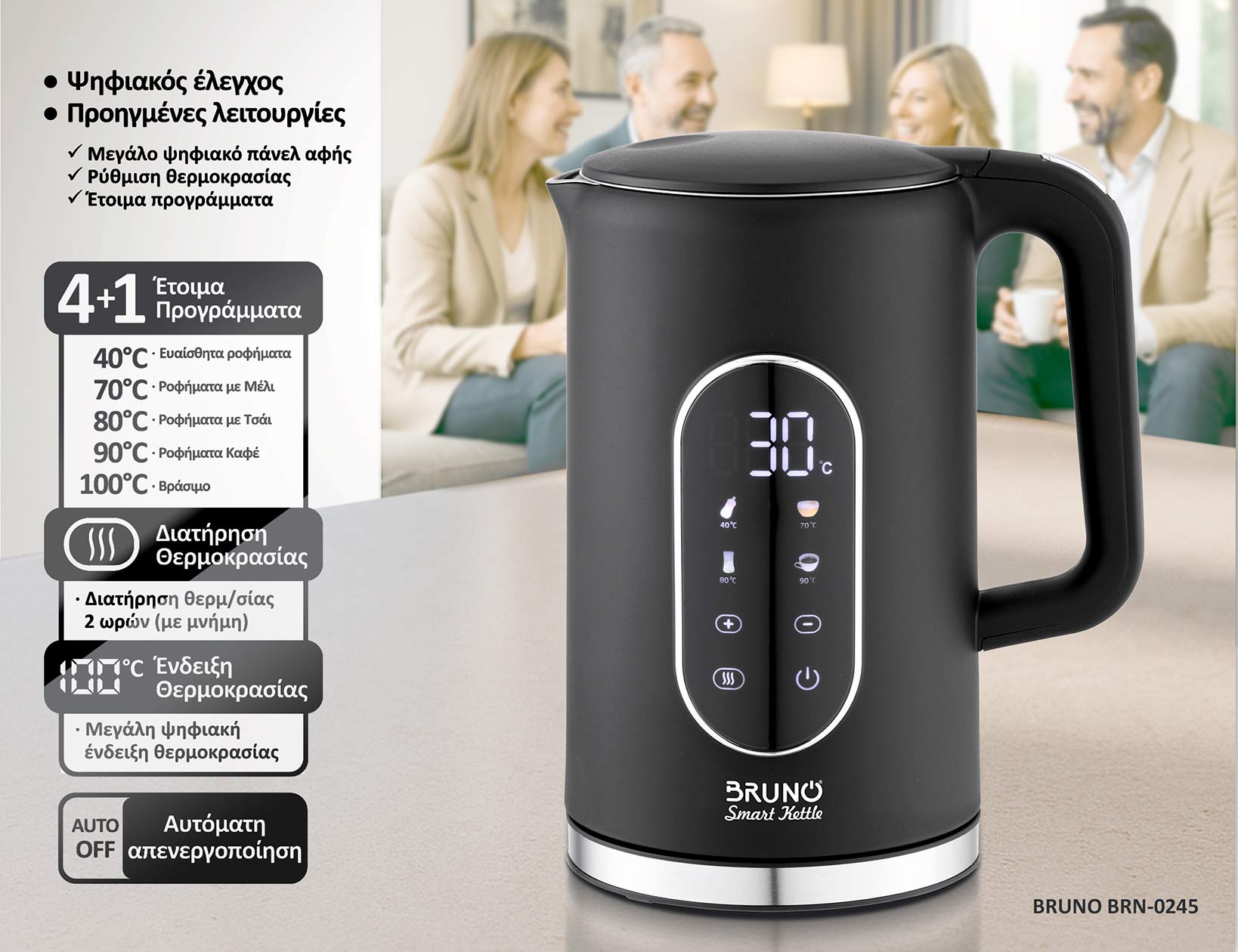 -4+1 έτοιμα προγράμματα ζεστάματος-βρασμού (40°C για ευαίσθητα ροφήματα, 70°C ροφήματα με μέλι, 80°C τσάι, 90°C καφές, 100°C βράσιμο)