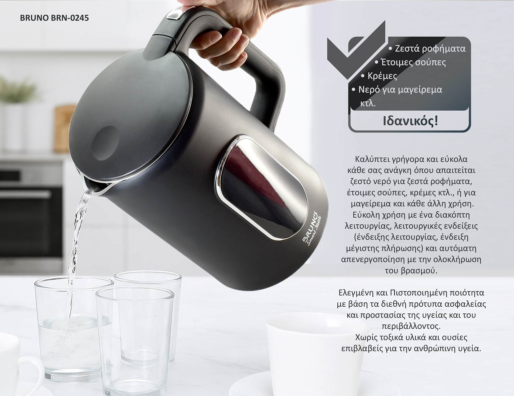 Ο ψηφιακός βραστήρας προηγμένων λειτουργιών BRUNO BRN-0245 καλύπτει γρήγορα και εύκολα κάθε σας ανάγκη όπου απαιτείται ζεστό νερό για ροφήματα, έτοιμες σούπες, κρέμες κτλ., ή για μαγείρεμα και κάθε άλλη χρήση.