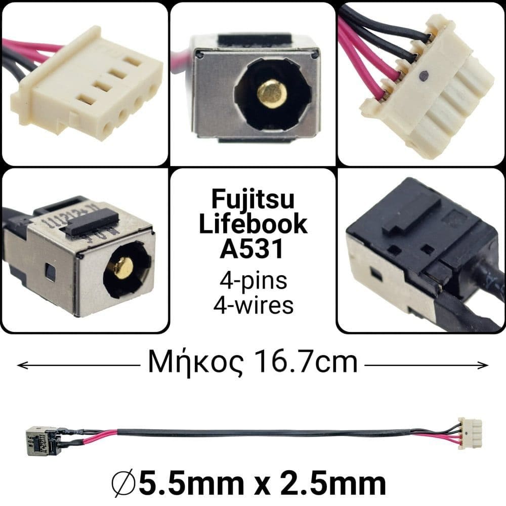Βύσμα Τροφοδοσίας DC Power Jack Socket Fujitsu Lifebook A531 AH530 AH531 LH530 LH531Item SKU: B025191Item Specification:2.5mm Central Pin DC Power JackPower Jack Socket Connector Charging Port DC IN CableOverall Length Approx 17cm4-Wire 4-Pin, Plug InItem Status: New, Geunine OEM Original, Top QualityCompatible Laptop Models: Fujitsu Lifebook AH530 AH531 LH530 LH531 Series