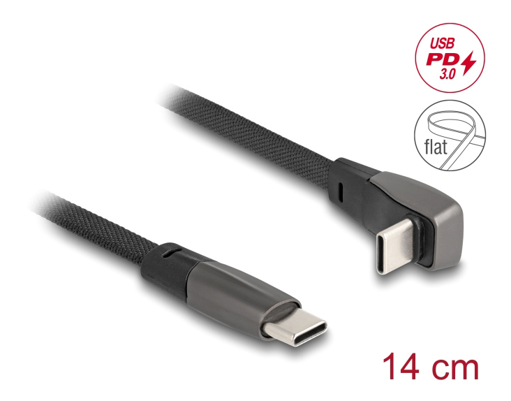 DELOCK καλώδιο USB-C 80750, 60W, flat, γωνιακό, 480 Mbps, 14cm, μαύρο