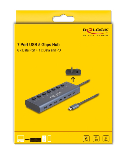 DELOCK USB-C hub 63410 με διακόπτες, 7x θυρών, 5Gbps, 20W, USB-C σύνδεση, μπλε