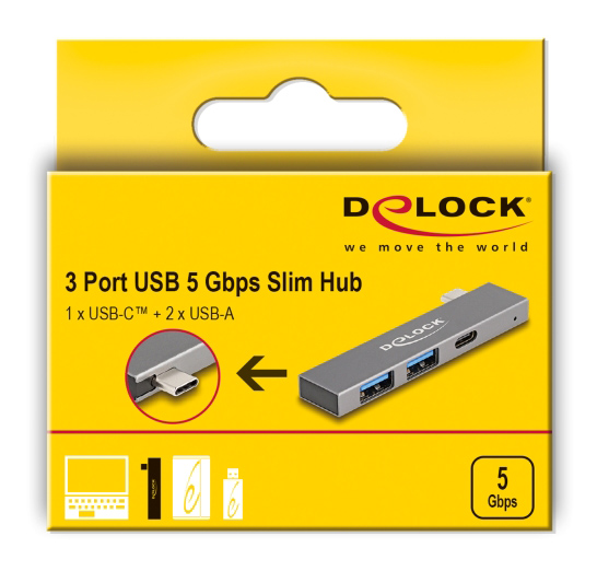 Αυτό το hub της Delock μπορεί να συνδεθεί με το laptop ή το desktop σας μέσω θύρας USB-C και να επεκτείνει τις θύρες του με 1x USB-C και 2x USB θύρες. Διαφορετικές συσκευές USB, όπως εξωτερικοί σκληροί δίσκοι, card readers κ.λπ. μπορούν να συνδεθούν μέσω του hub.