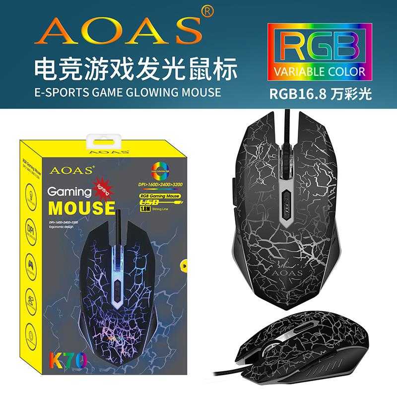 To ποντίκι Aoas Κ70 είναι ένα gaming ποντίκι σχεδιασμένο και για τα δύο χέρια, με οπτικό αισθητήρα και ανάλυση 2400 DPI. Διαθέτει 3 κουμπιά και φωτισμό RGB που μπορεί να πάρει διάφορες αποχρώσεις.
