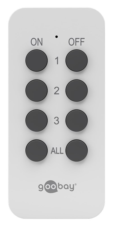 Ασύρματο τηλεχειριστήριο της Goobay που σας επιτρέπει τον απομακρυσμένο έλεγχο ραδιοελεγχόμενου αντάπτορα ρεύματος, σε εμβέλεια έως 30 μέτρων.