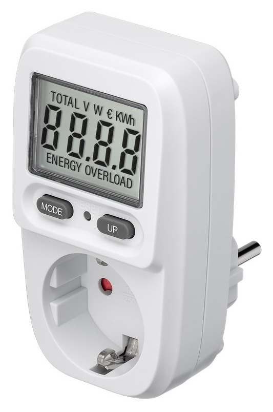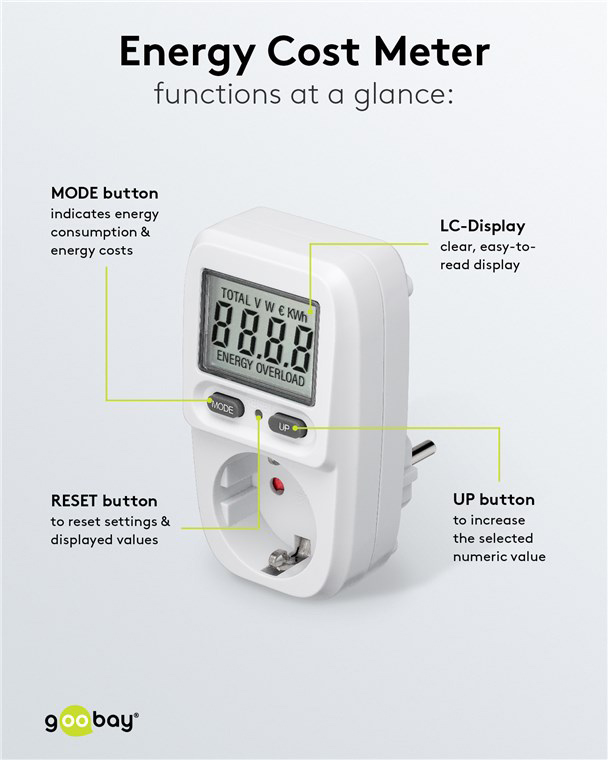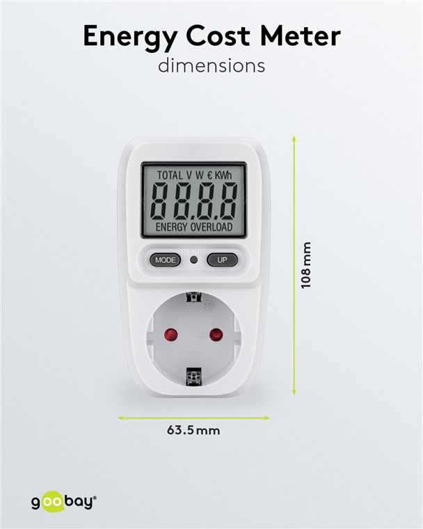 Μετρητής της Goobay για τη μέτρηση της κατανάλωσης ρεύματος των συνδεδεμένων οικιακών ηλεκτρικών συσκευών. Ενσωματώνει ευανάγνωστη οθόνη που σας επιτρέπει να παρακολουθείτε την κατανάλωση του ρεύματος αλλά και το κόστος σε ευρώ/kWh. Η ανάγνωση των δεδομένων μπορεί να γίνει σε πραγματικό χρόνο αλλά και μακροπρόθεσμα εφόσον παραμείνει συνδεδεμένη στην πρίζα η ηλεκτρική συσκευή.