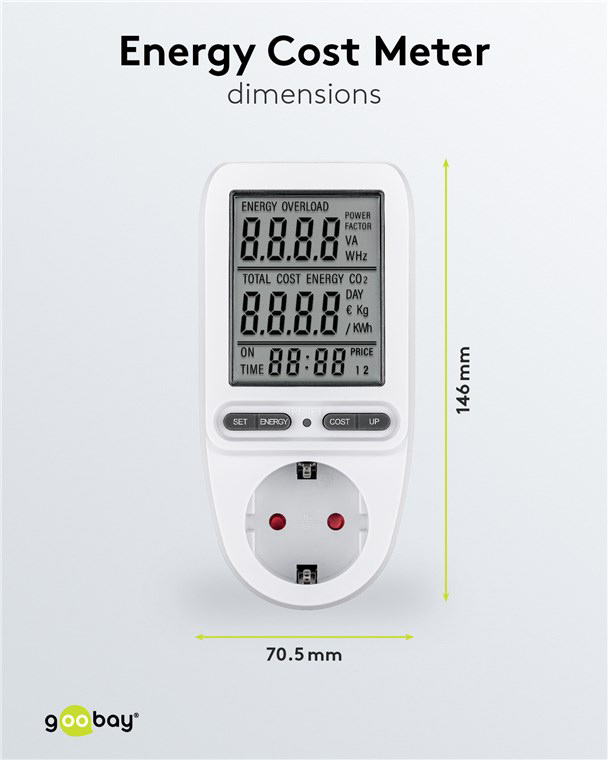Μετρητής της Goobay για τη μέτρηση της κατανάλωσης ρεύματος των συνδεδεμένων οικιακών ηλεκτρικών συσκευών. Ενσωματώνει ευανάγνωστη οθόνη που σας επιτρέπει να παρακολουθείτε την κατανάλωση του ρεύματος κόστος σε ευρώ/kWh αλλά και τον χρόνο κατανάλωσης. Τα δεδομένα μπορούν να αποθηκευτούν για έως 20 λεπτά μετά την αποσύνδεση της συσκευής, επιτρέποντας σας την εναλλαγή διαφορετικών ηλεκτρικών συσκευών χωρίς να χάσετε τα δεδομένα.