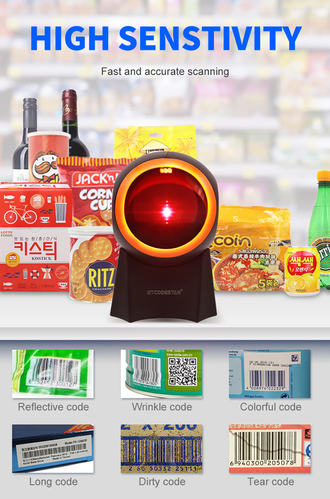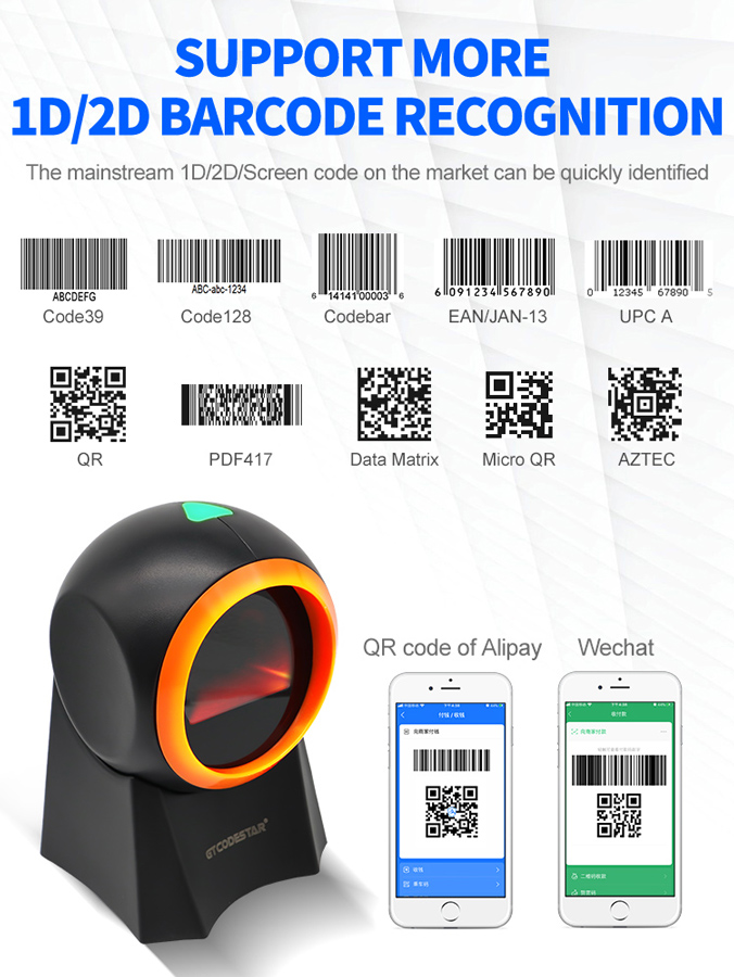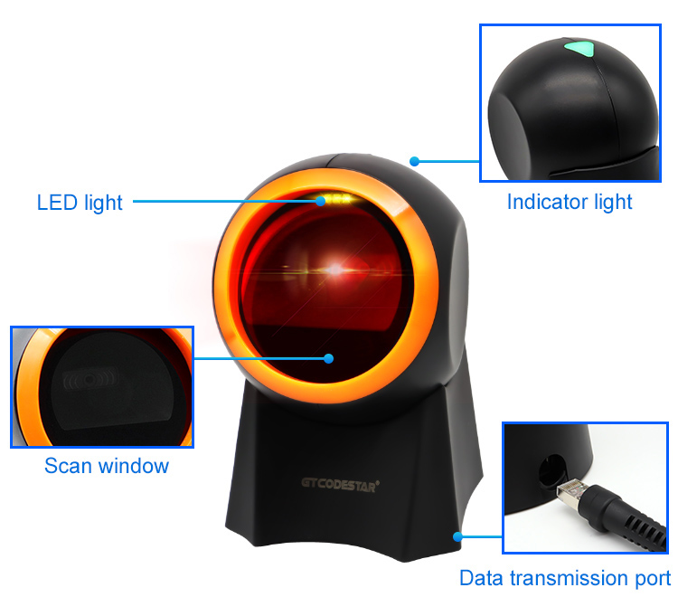 Επιτραπέζιο barcode scanner της GTCODESTAR για γρήγορη και ακριβή ανάγνωση 1D και 2D barcodes. Η σύνδεση του γίνεται ενσύρματα μέσω καλωδίου USB (συμπεριλαμβάνεται).