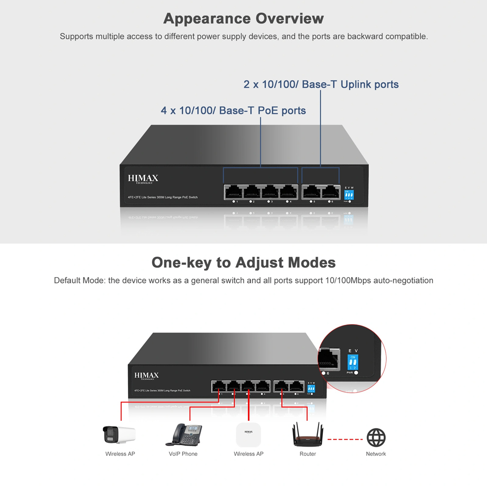Το switch της HIMAX σας επιτρέπει να επεκτείνετε το ενσύρματο δίκτυο σας με 4x Ethernet PoE και 2x uplink Ethernet θύρες δικτύου.