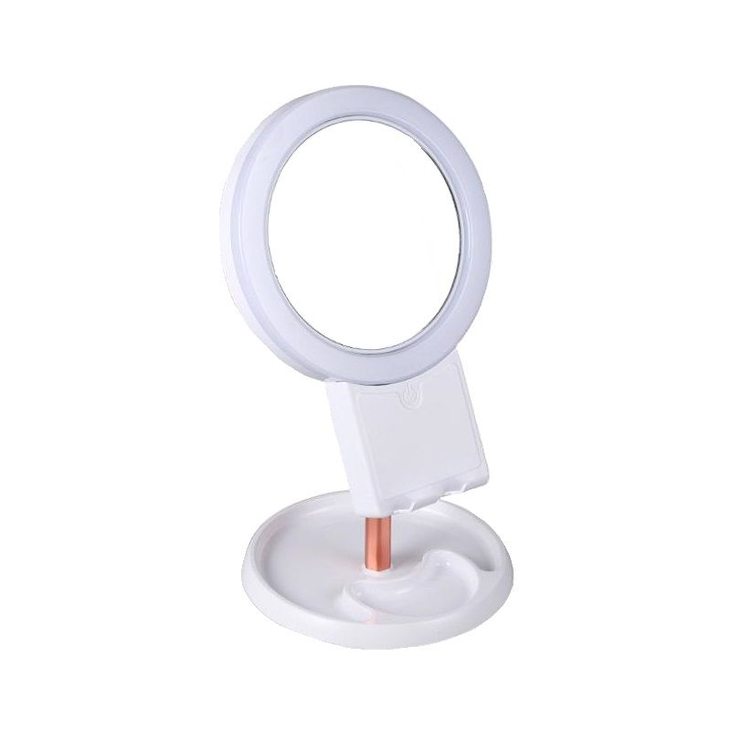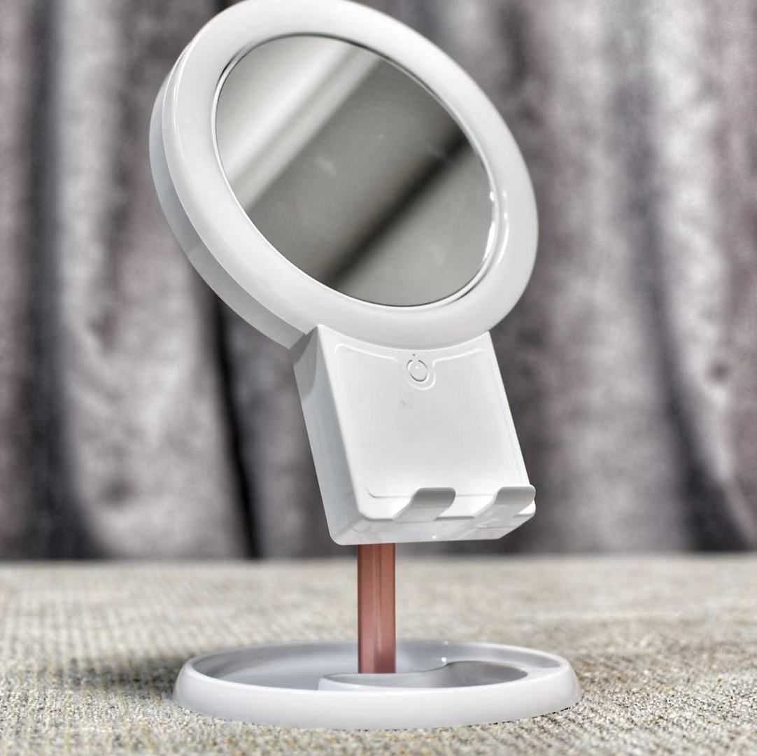 Καθρέπτης μακιγιάζ διπλής όψης, με περιμετρικό φωτισμό LED και στις δυο πλευρές. H μία πλευρά διαθέτει μεγέθυνση 10x. Διαθέτει βάση στήριξης κινητού τηλεφώνου και βάση τοποθέτησης προϊόντων. Είναι πτυσσόμενος για να ρυθμίζετε εσείς την γωνία που σας βολεύει περισσότερο.