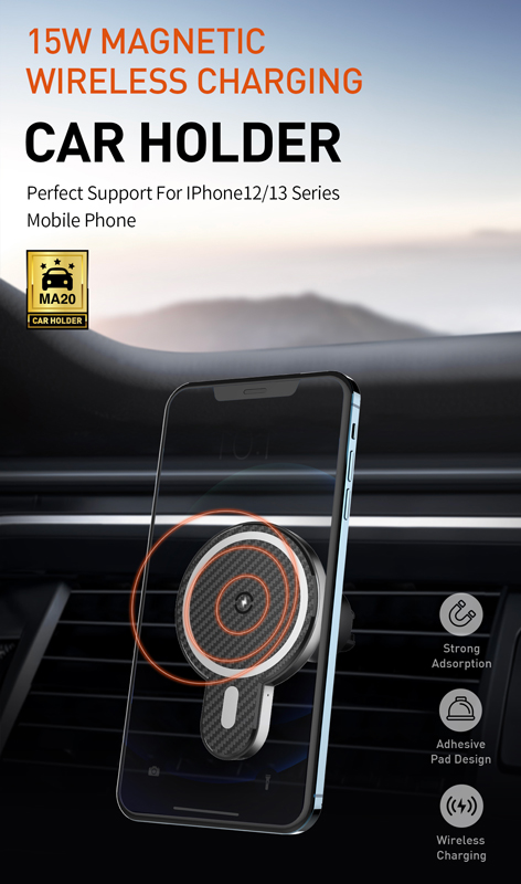 Ασύρματος φορτιστής και βάση αυτοκινήτου με στήριξη σε οριζόντιους ή κάθετους αεραγωγούς του αυτοκινήτου. Συγκρατεί το smartphone σταθερό και ασφαλές με ισχυρή μαγνητική δύναμη ενώ παράλληλα το φορτίζει ασύρματα με απόδοση έως 15W.