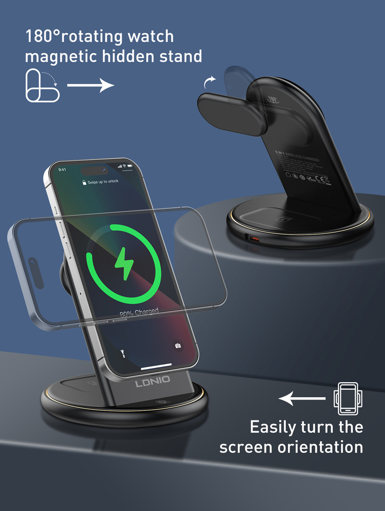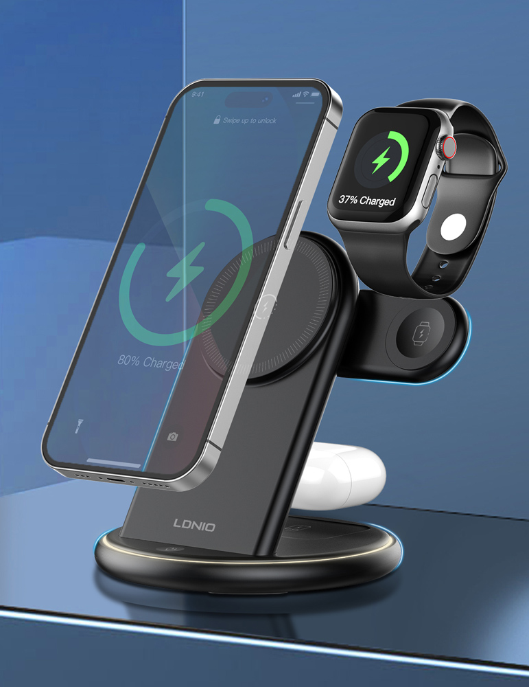 LDNIO ασύρματος φορτιστής WL02 με LED φωτισμό, 3 σε 1, 15W, μαύρος