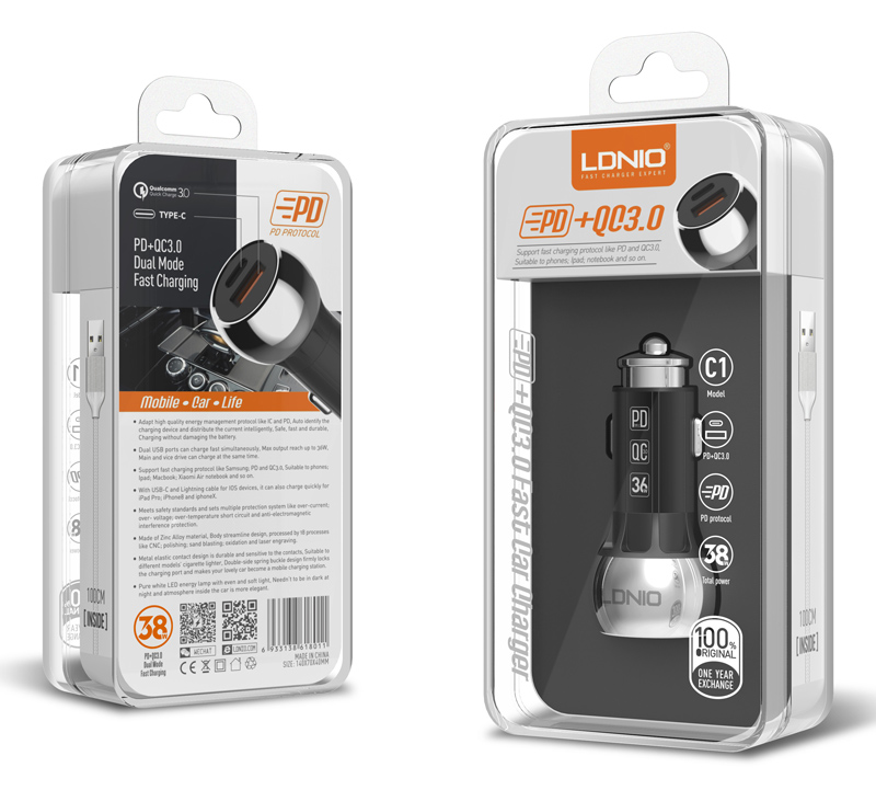 LDNIO φορτιστής αυτοκινήτου C1 με καλώδιο, USB & USB-C, 38W PD, μαύρος