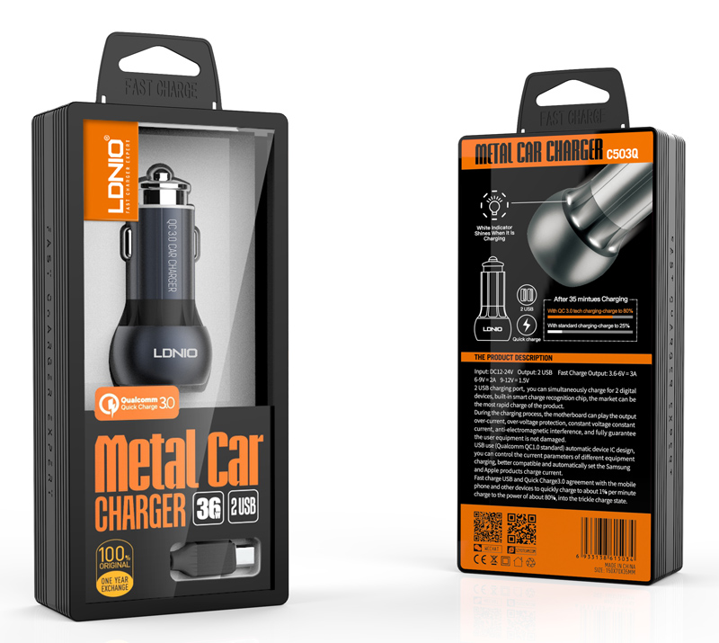 Υψηλής απόδοσης USB φορτιστής αυτοκινήτου της LDNIO, κατασκευασμένος από ανθεκτικό υλικό και συμβατός με συσκευές που φορτίζουν μέσω θύρας USB.