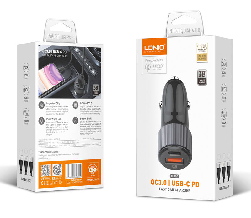 LDNIO φορτιστής αυτοκινήτου C510Q με καλώδιο, USB & USB-C, 38W, μαύρος