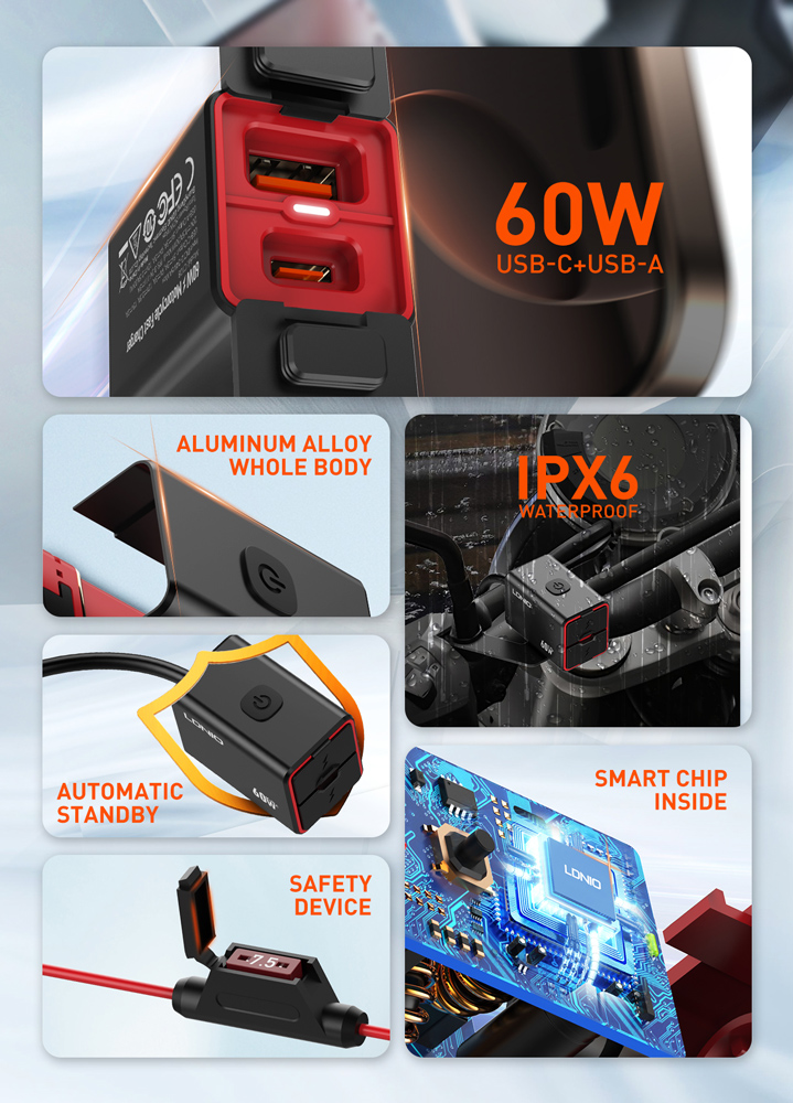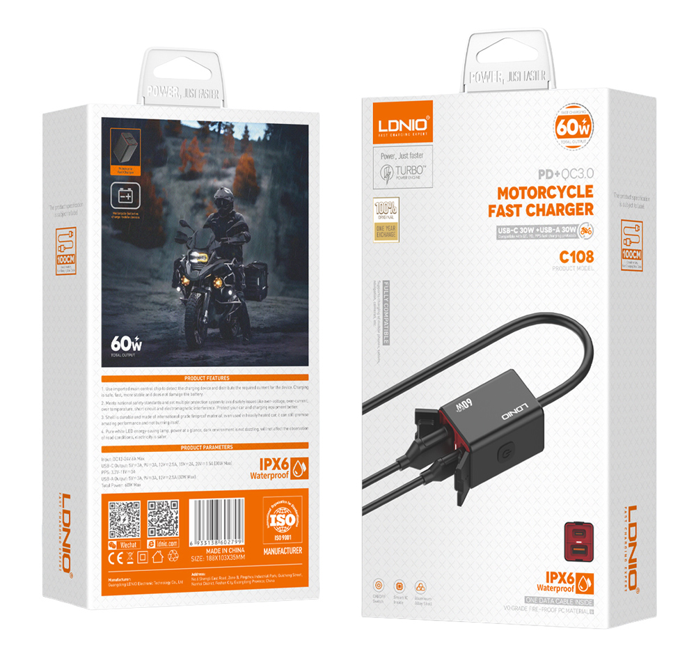 LDNIO φορτιστής μοτοσυκλέτας C108 με καλώδιο, USB/USB-C, 60W, μαύρος