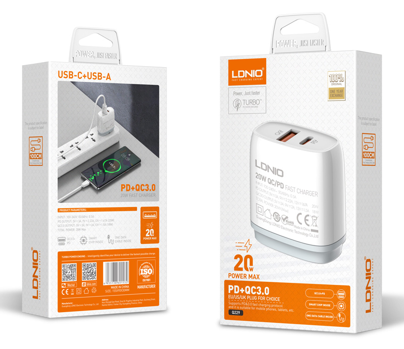 LDNIO φορτιστής τοίχου Q229 με καλώδιο, USB & USB-C, 20W PD, λευκός