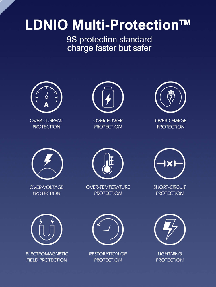 Φορτιστής τοίχου από την LDNIO, κατάλληλος για χρήση με τύπους πριζών EU (Ευρώπης), UK (Αγγλίας) και US (Αμερικής), χάρη στα εναλλάξιμα βύσματα που διαθέτει.