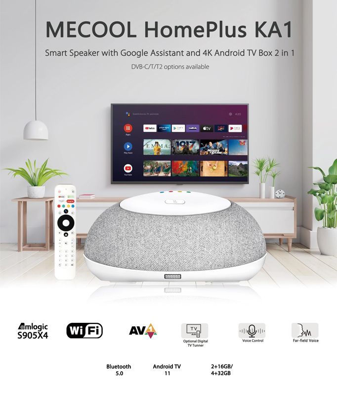 Το HomePlus KA1 από την Mecool είναι μια έξυπνη συσκευή που λειτουργεί ως TV Box, αποκωδικοποιητής και smart ηχείο, ενώ χάρη στα 2 ενσωματωμένα μικρόφωνα, υποστηρίζει τον έλεγχο των smart συσκευών σας μέσω φωνητικών εντολών.