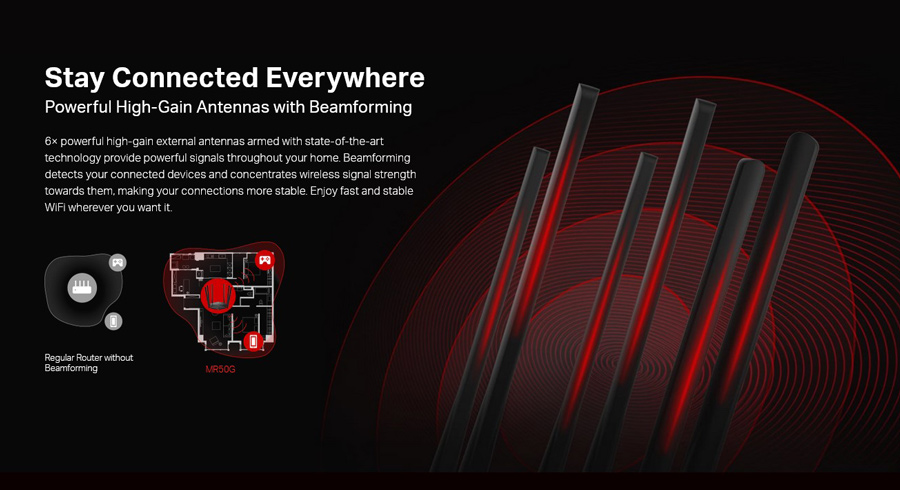 Με ασύρματη ταχύτητα 1300 Mbps από τη ζώνη 5GHz και 600Mbps από τη ζώνη 2.4 GHz, το MR50G σας προσφέρει την ευελιξία δύο αποκλειστικών δικτύων και εξασφαλίζει εκπληκτική ασύρματη απόδοση.